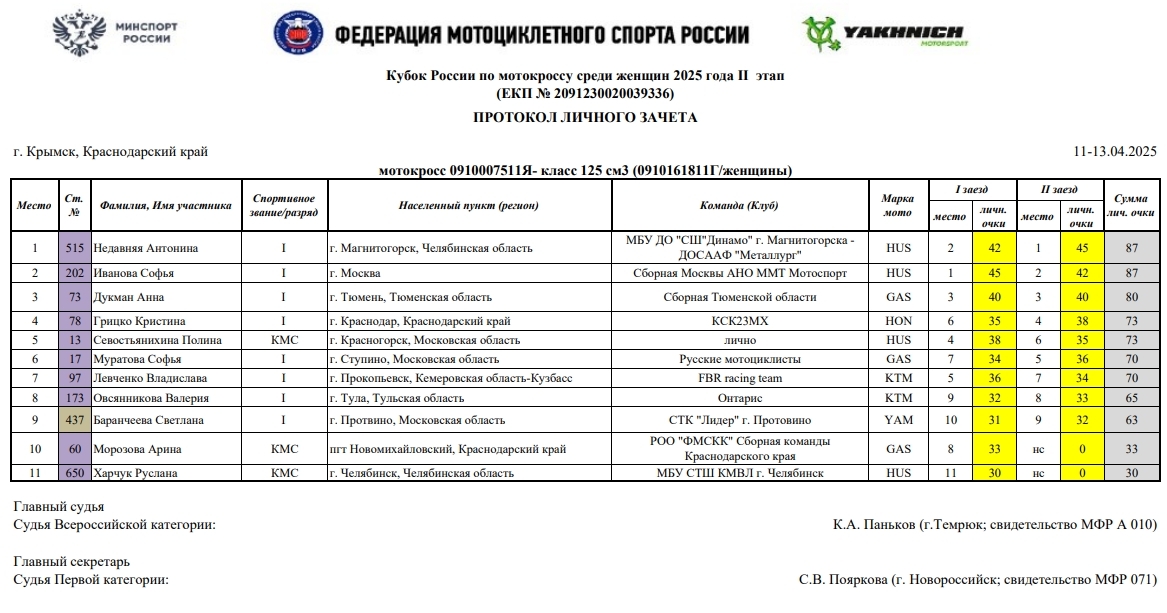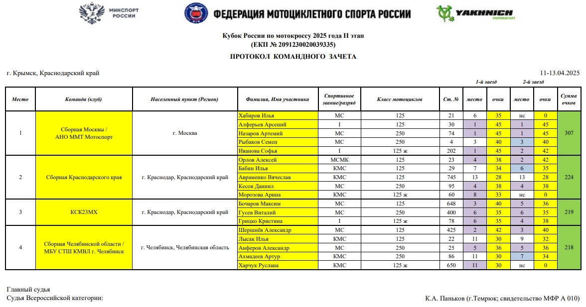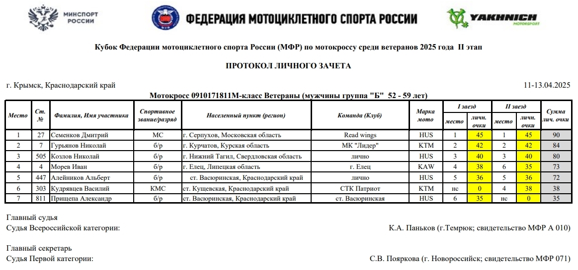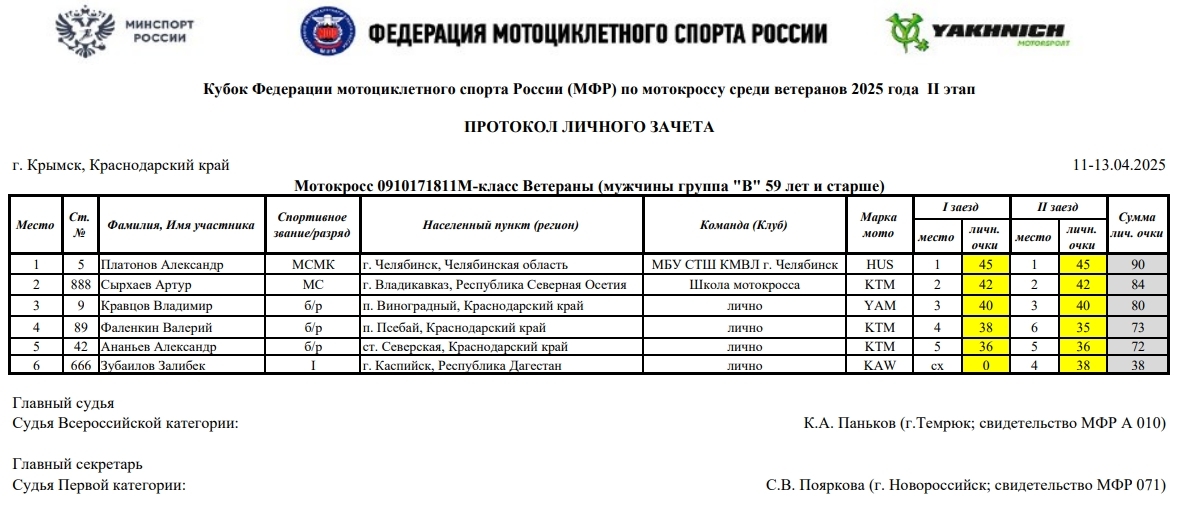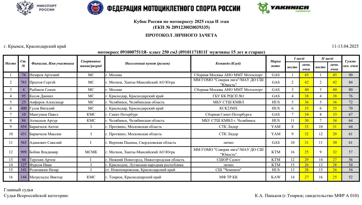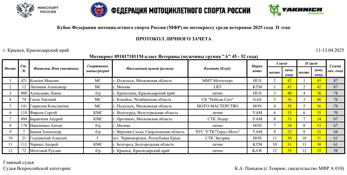 В минувшие выходные 12 и 13 апреля на мотоциклетной трассе «Скала» в г.Крымск прошел второй этап Кубка России по мотокроссу 2025 года (мужчины и женщины), Кубка МФР среди ветеранов, а также Кубок главы муниципального образования Крымский район, посвящнный празднованию 80-летия Победы советского народа в Великой Отечественной войне. Предлагаем ознакомиться с результатами соревнований: