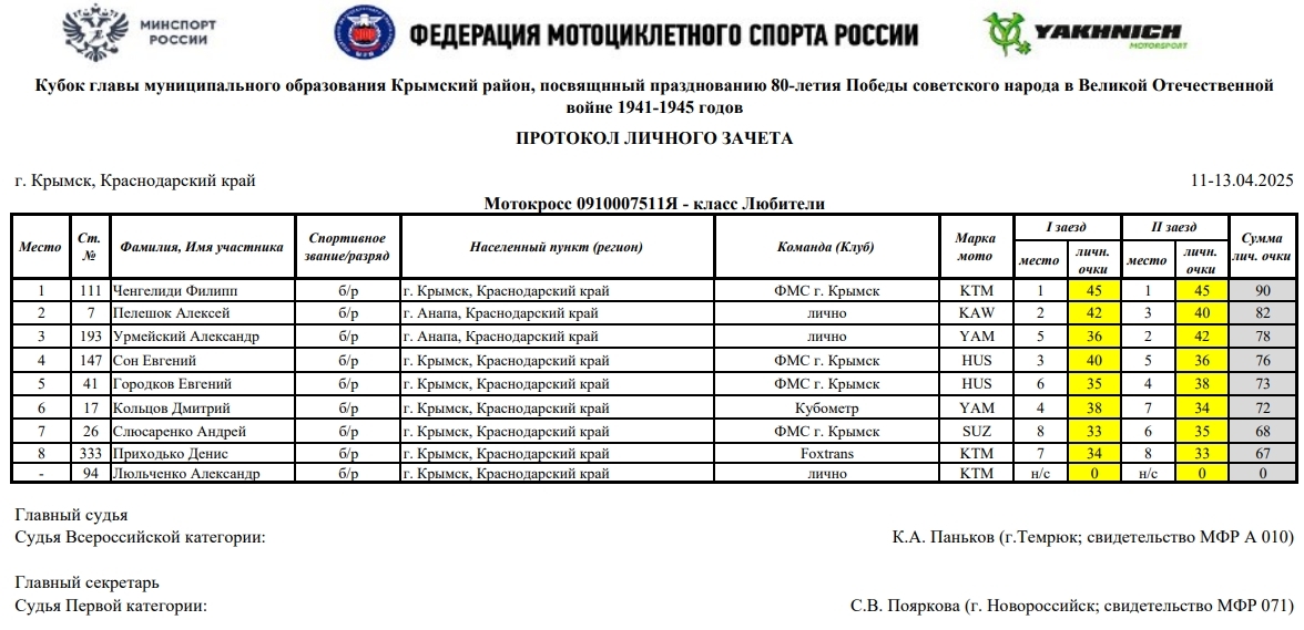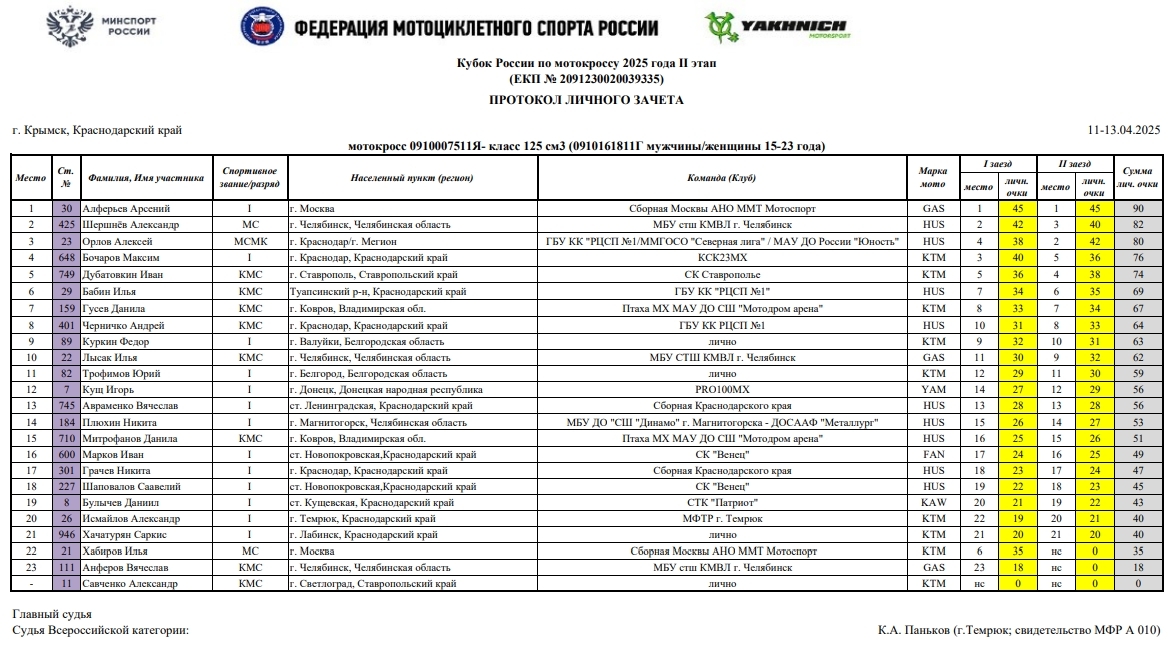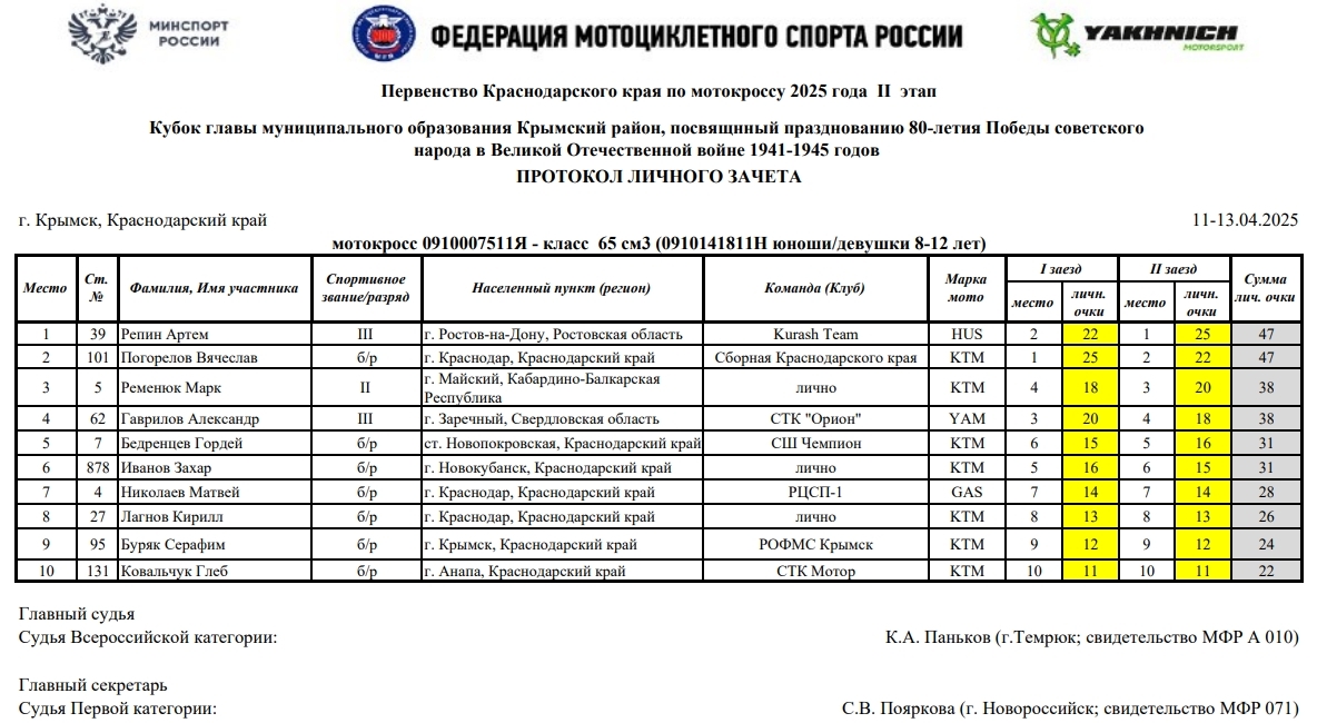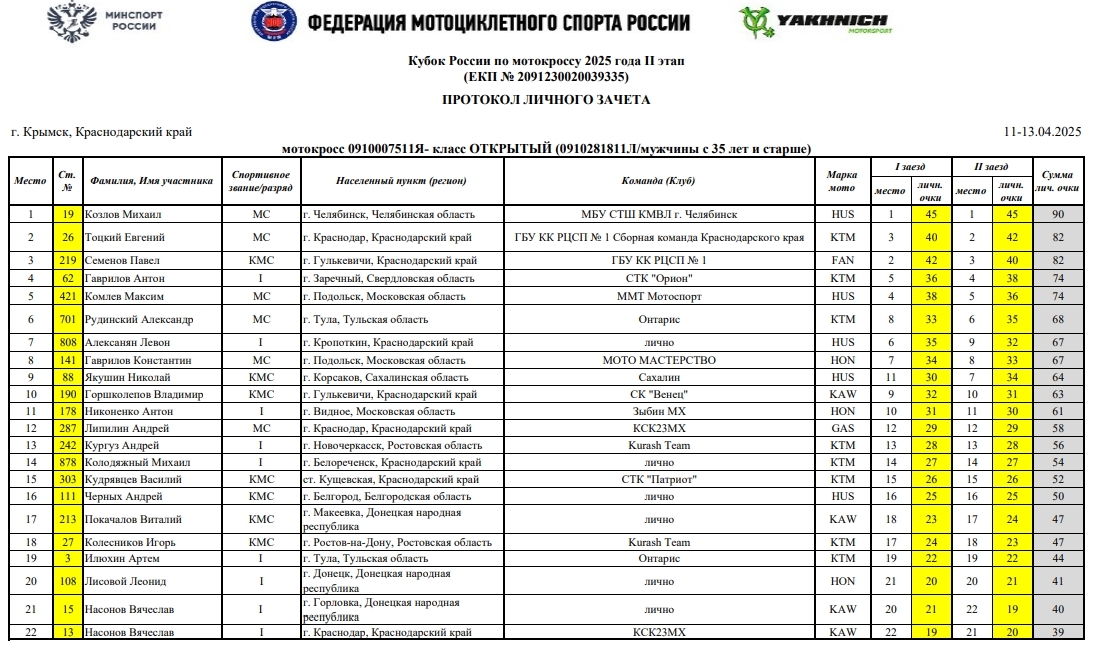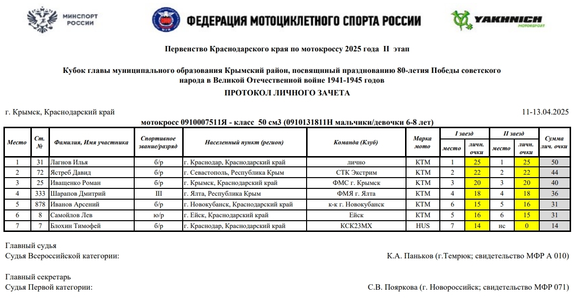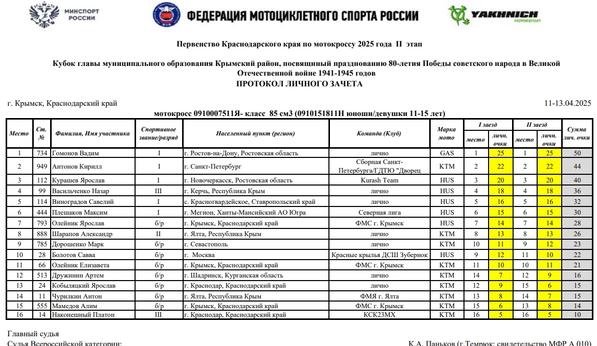 В минувшие выходные 12 и 13 апреля на мотоциклетной трассе «Скала» в г.Крымск прошел второй этап Кубка России по мотокроссу 2025 года (мужчины и женщины), Кубка МФР среди ветеранов, а также Кубок главы муниципального образования Крымский район, посвящнный празднованию 80-летия Победы советского народа в Великой Отечественной войне. Предлагаем ознакомиться с результатами соревнований: