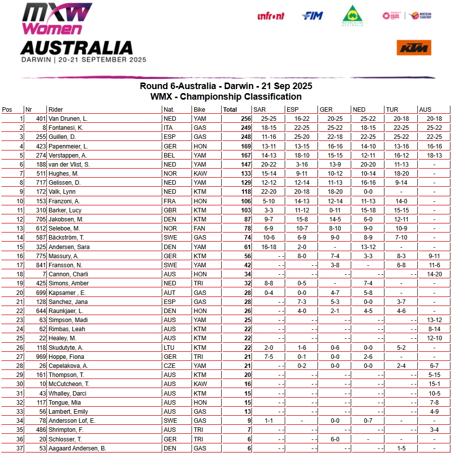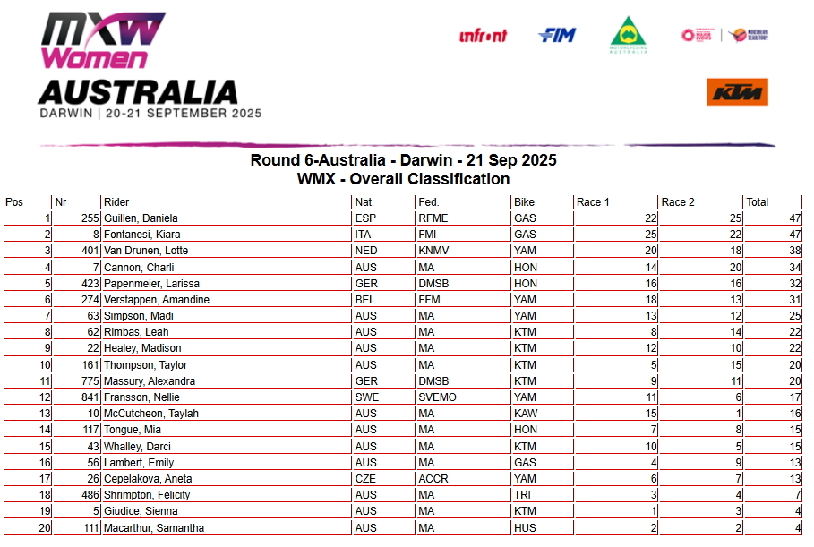 В женском зачете WMX победительницей стала испанка Даниэла Гильен. Голландская гонщица Лотте Ван Друнен по итогам заездов финишировала на третьей позиции и теперь в ее активе второй титул чемпионки мира.