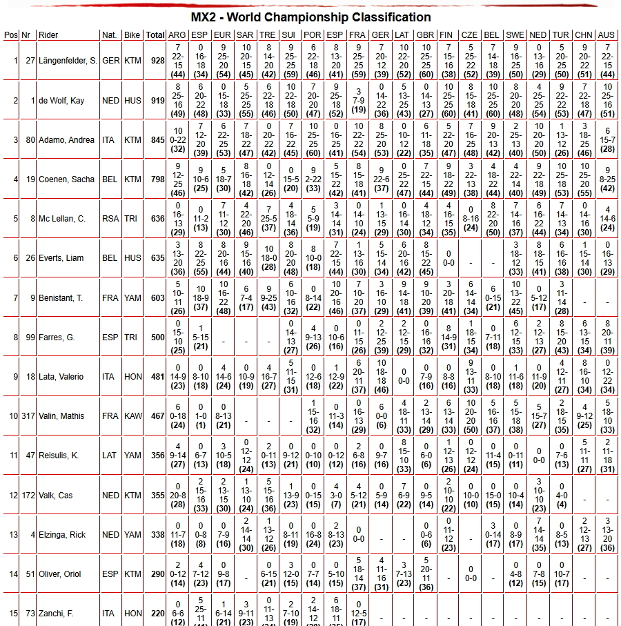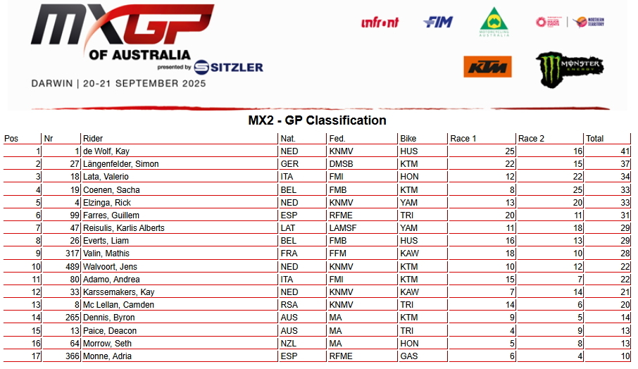 В классе МХ2 сильнейшим оказался голландец Кей Де Вольф. Саймон Лангенфельдер занял второе место и завоевал свой первый титул чемпиона мира 2025 года.