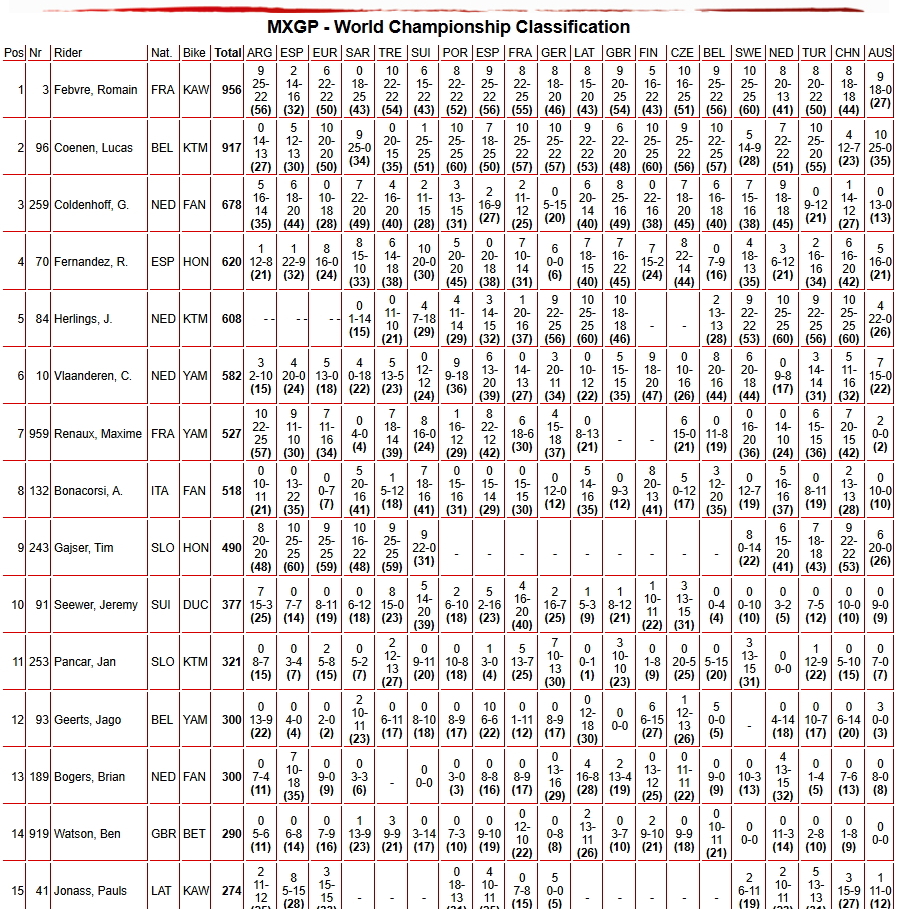 В классе MXGP был проведен всего один зазед, а второй был отменен из-за дождя. По его итогам победителем стал бельгиец Лукас Кунен. Француз Ромен Фефр занял четвертое место и спустя десять лет завоевал свой второй титул чемпиона мира в премьер-классе.