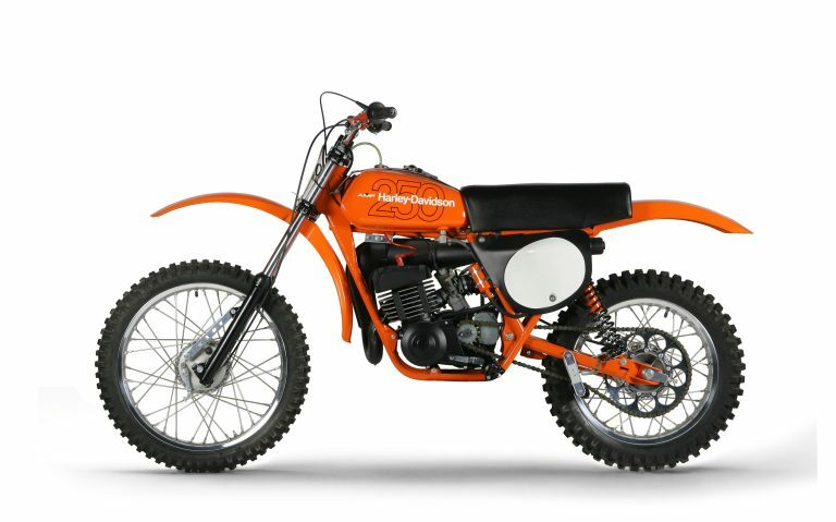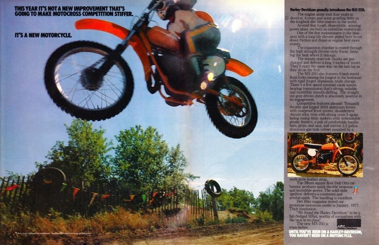 Когда в середине семидесятых популярность мотокросса и езды по бездорожью резко возросла, в Harley решили, что настало время использовать опыт их итальянского производства машин с двухтактными двигателями для разработки «американской» машины для мотокросса. В 1975 году первый MX-250 дебютировал в ограниченном количестве в качестве эксперимента, чтобы оценить интерес и оценить жизнеспособность продвижения вперед. Всего было построено 65 оригинальных MX-250, и сегодня их больше помнят за их странную заднюю подвеску, в которой вместо традиционных амортизаторов использовалась передняя вилка, чем за все, что было сделано на трассе.