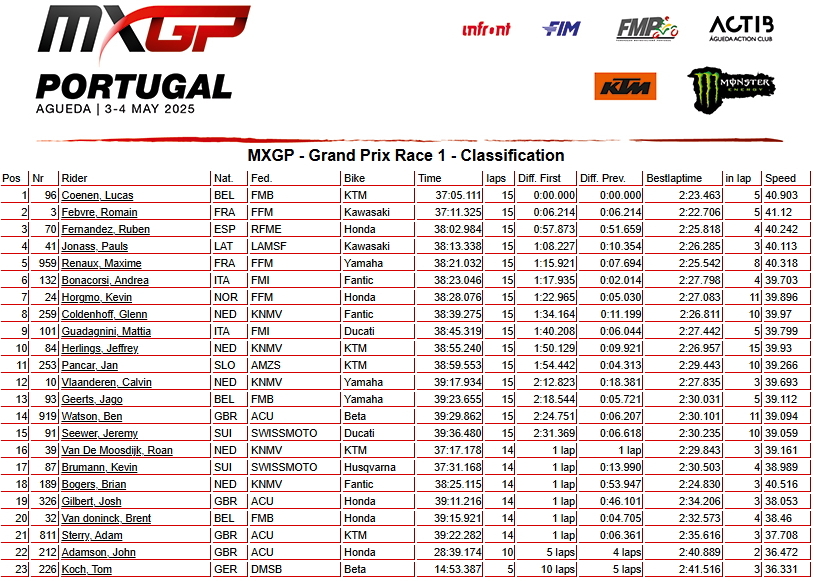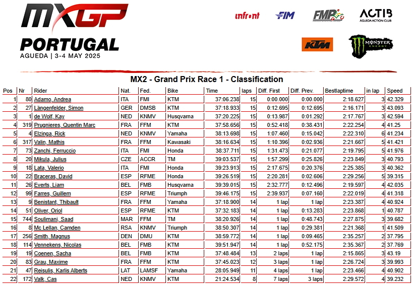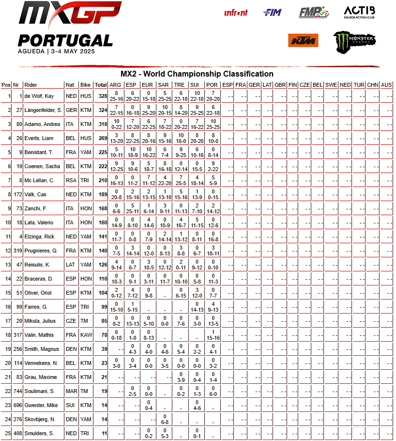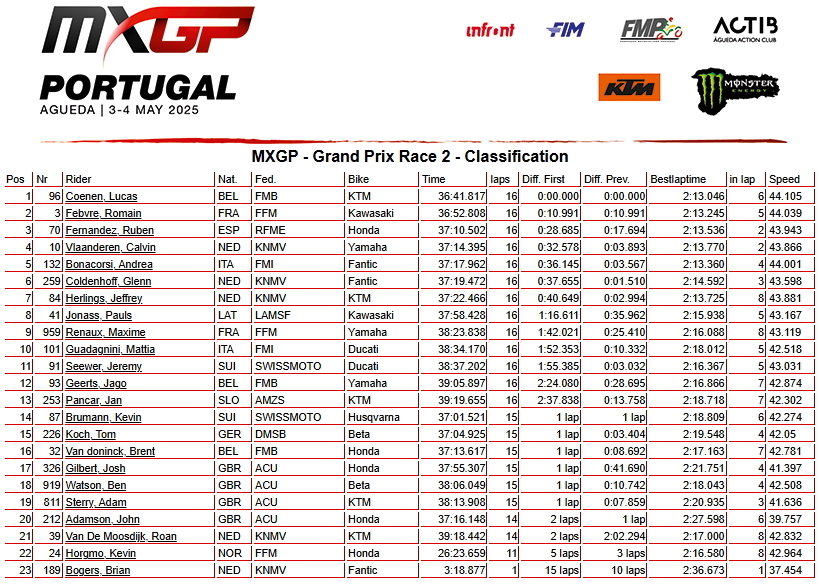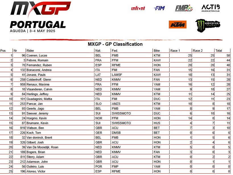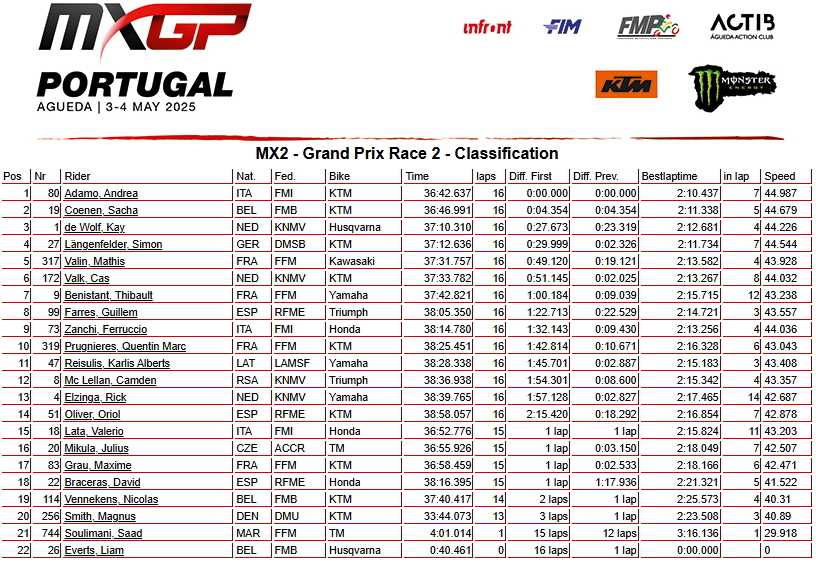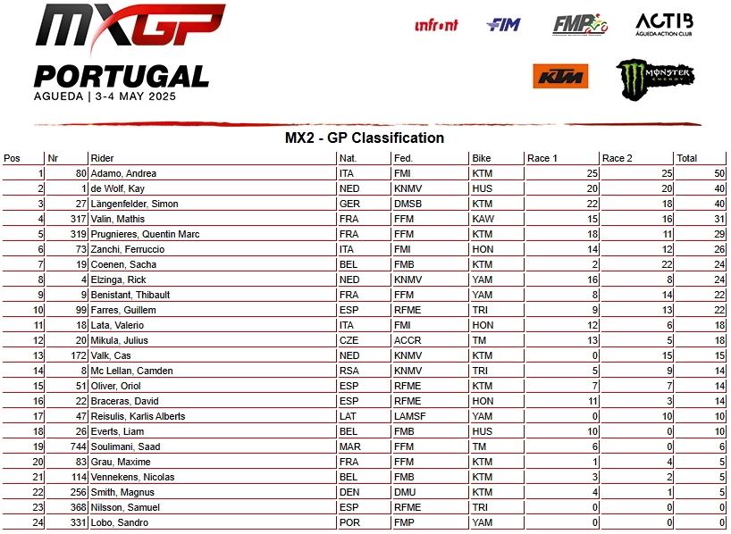 Сегодня на трассе Агеда прошли основные заезды 7-го этапа Чемпионата мира по мотокроссу 2025 года - Гран-при Португалии, абсолютными победителями которого стали итальянец Андреа Адамо в классе МХ2 и бельгиец Лукас Коэнен в классе MXGP. Ромен Февра занял второе место и возглавил общий зачет.
