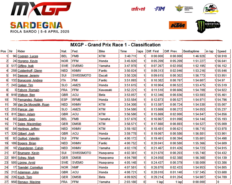Победитель первого заезда Лукас Коэнен из Бельгии в итоге занял лишь 7-е место. Он столкнулся в прыжке с Джереми Сивером, что имело катастрофические последствия для гонщика KTM, в то время как гонщик Ducati удержался на ногах и рванул вперед!