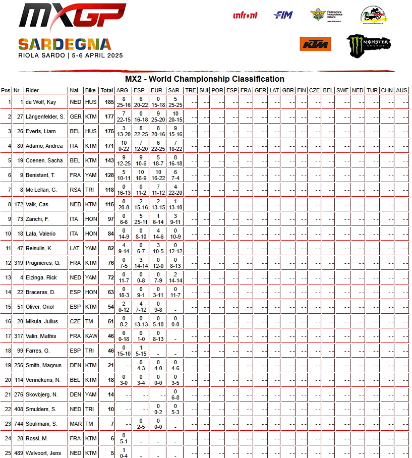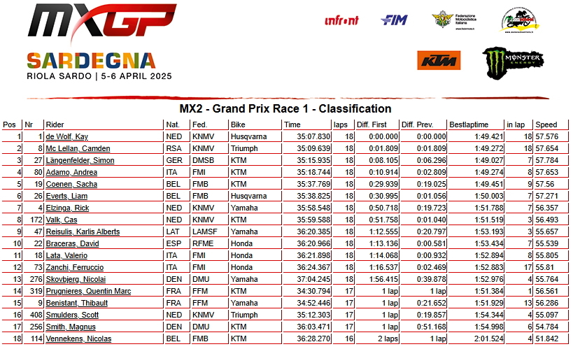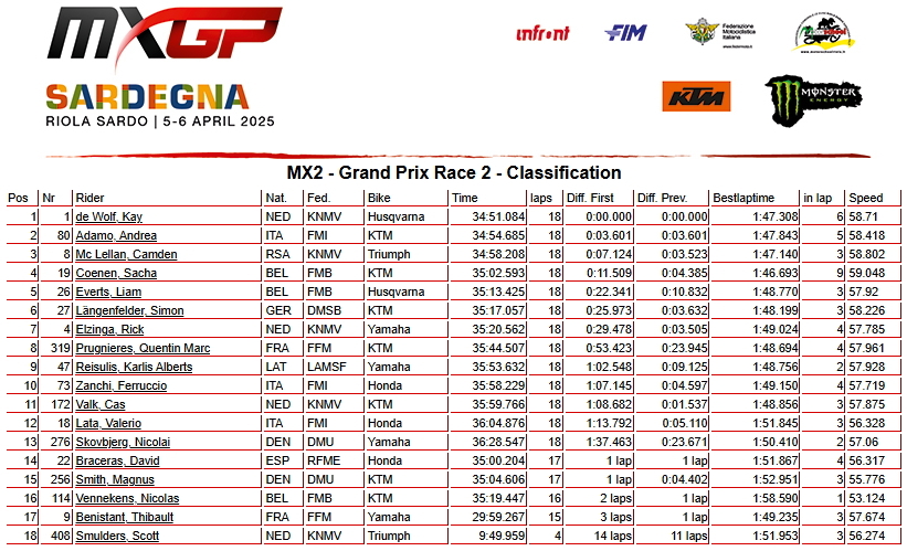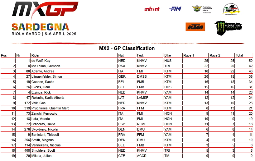 Абсолютным победителем в классе МХ2 стал действующий чемпион - голландец Кей Де Вольф и возглавил общий зачет. Камден МакЛеллан из ЮАР стал вторым, третье место у итальянца Андреа Адамо. Бельгиец Лиам Эвертс занял шестое место.