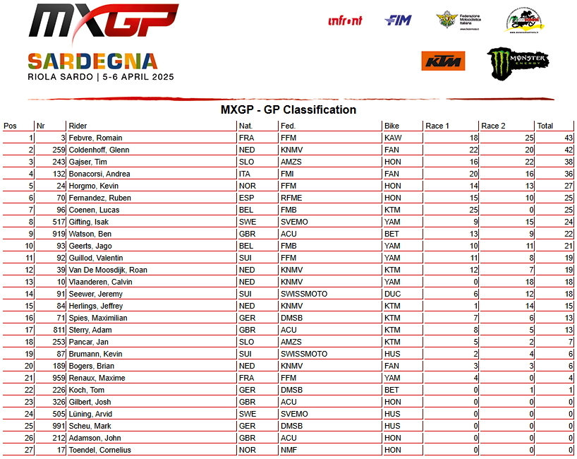 В классе MXGP победу одержал француз Ромен Февр. Второе место у голландца Гленна Колденхоффа, а третье у словенца Тима Гайсера.
