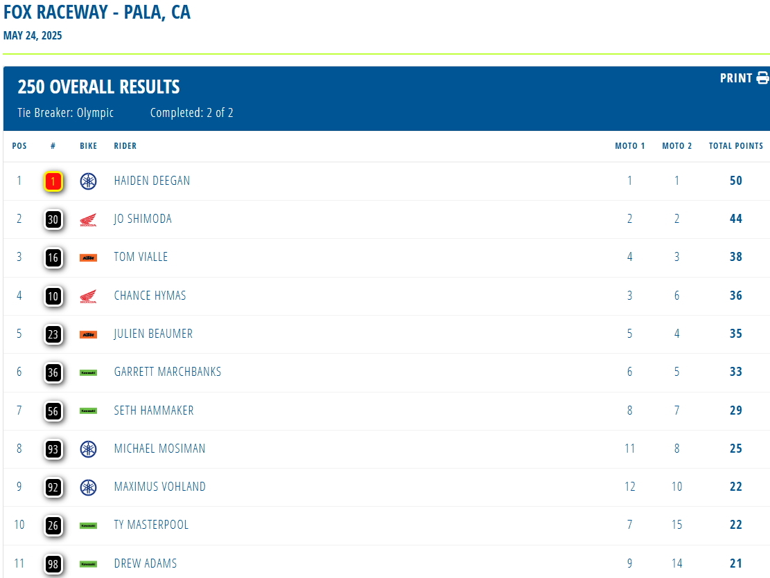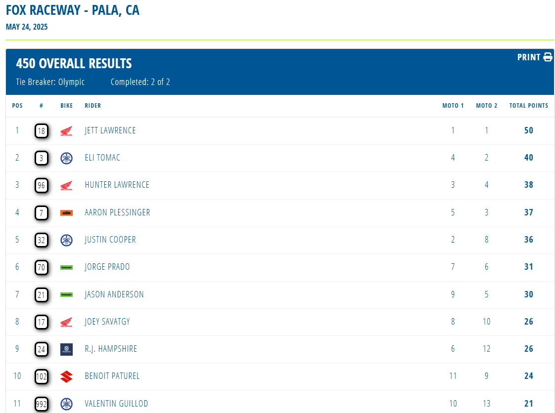 В минувшую субботу, 24 мая на трассе Fox Raceway в Пала прошел первый этап долгожданной серии АМА Мотокросс 2025 года, абсолютными победителями которого стали: Хайден Диган (250МХ) и Джетт Лоуренс (класс 450МХ).