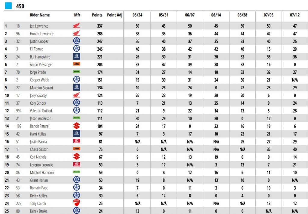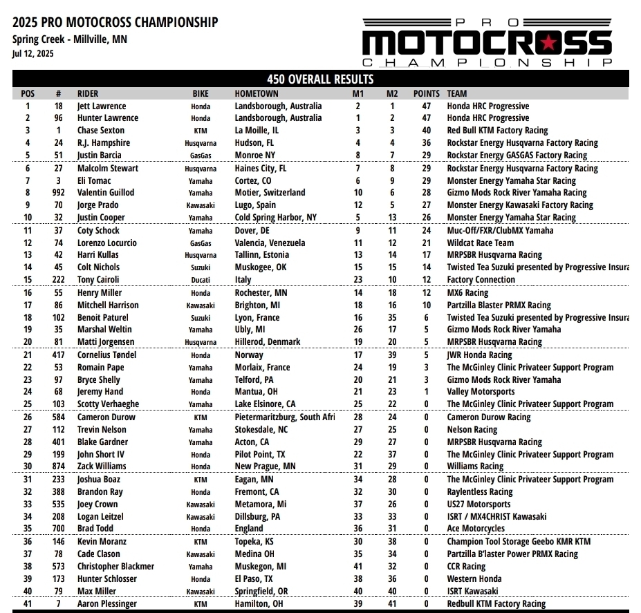 В классе 450МХ, победителем стал австралиец Джетт Лоуренс и это его седьмая победа из семи возможных. Испанец Хорхе Прадо по итогам заездов занял 9-е место. Антонио Кайроли финишировал 15-м (23 и 10 места в заездах).