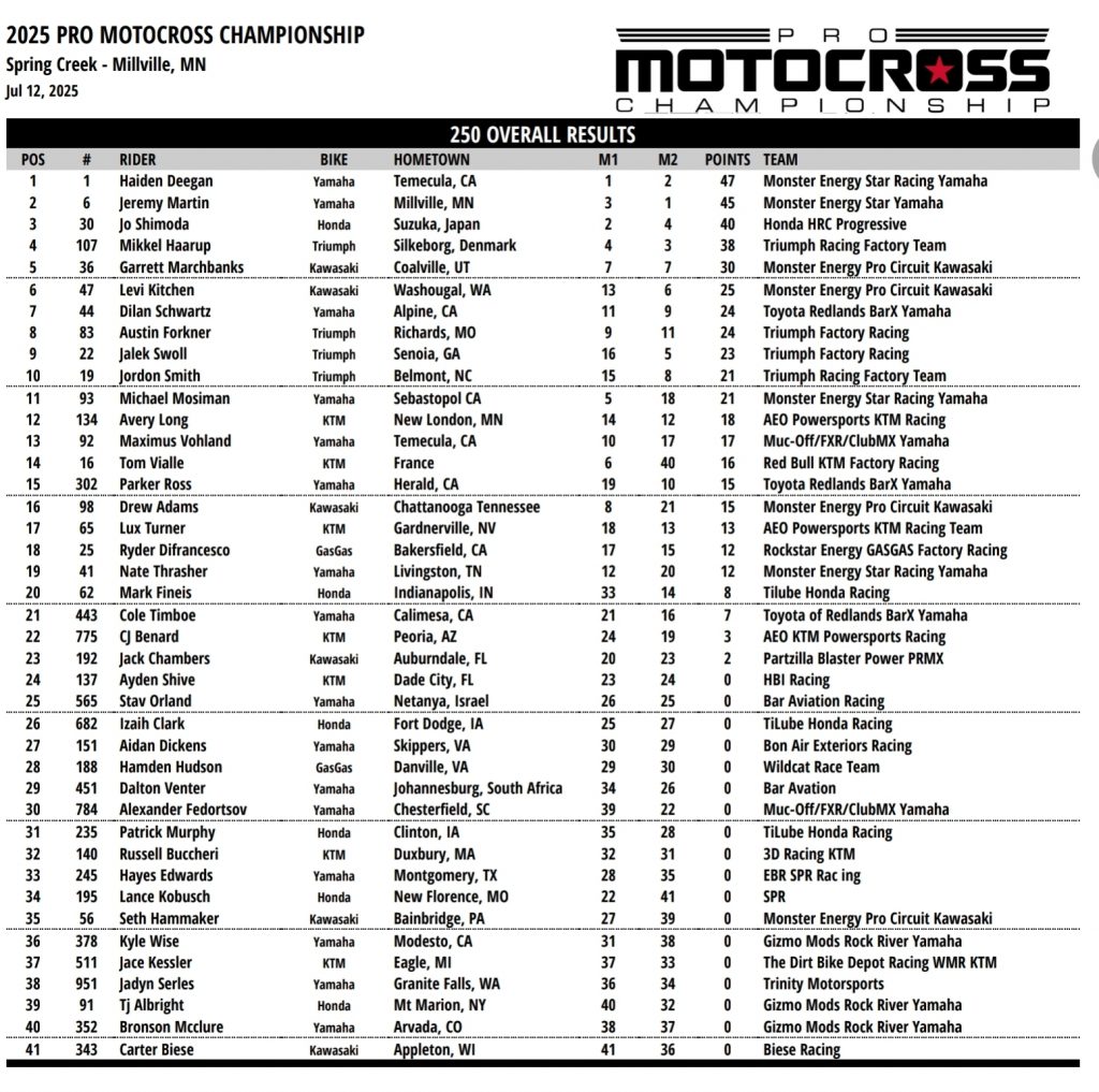 Победителем в классе 250МХ стал Хаден Диган. Второе место занял Джереми Мартин и это отличный результат для завершения карьеры на домашней трассе. Третье место у Джо Шимода.