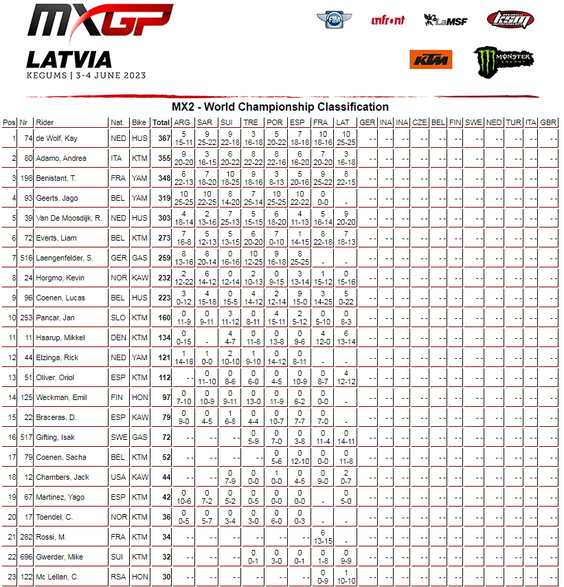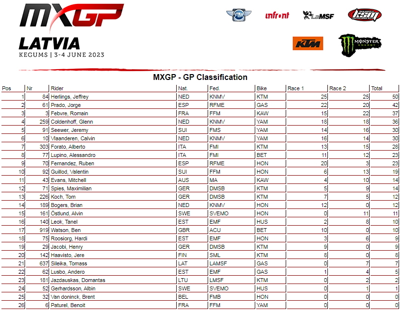 Абсолютными победителями стали: в классе МХ2 Кай Де Вульф (он же возглавил и общий зачет), а в MXGP - Джеффри Херлингс.