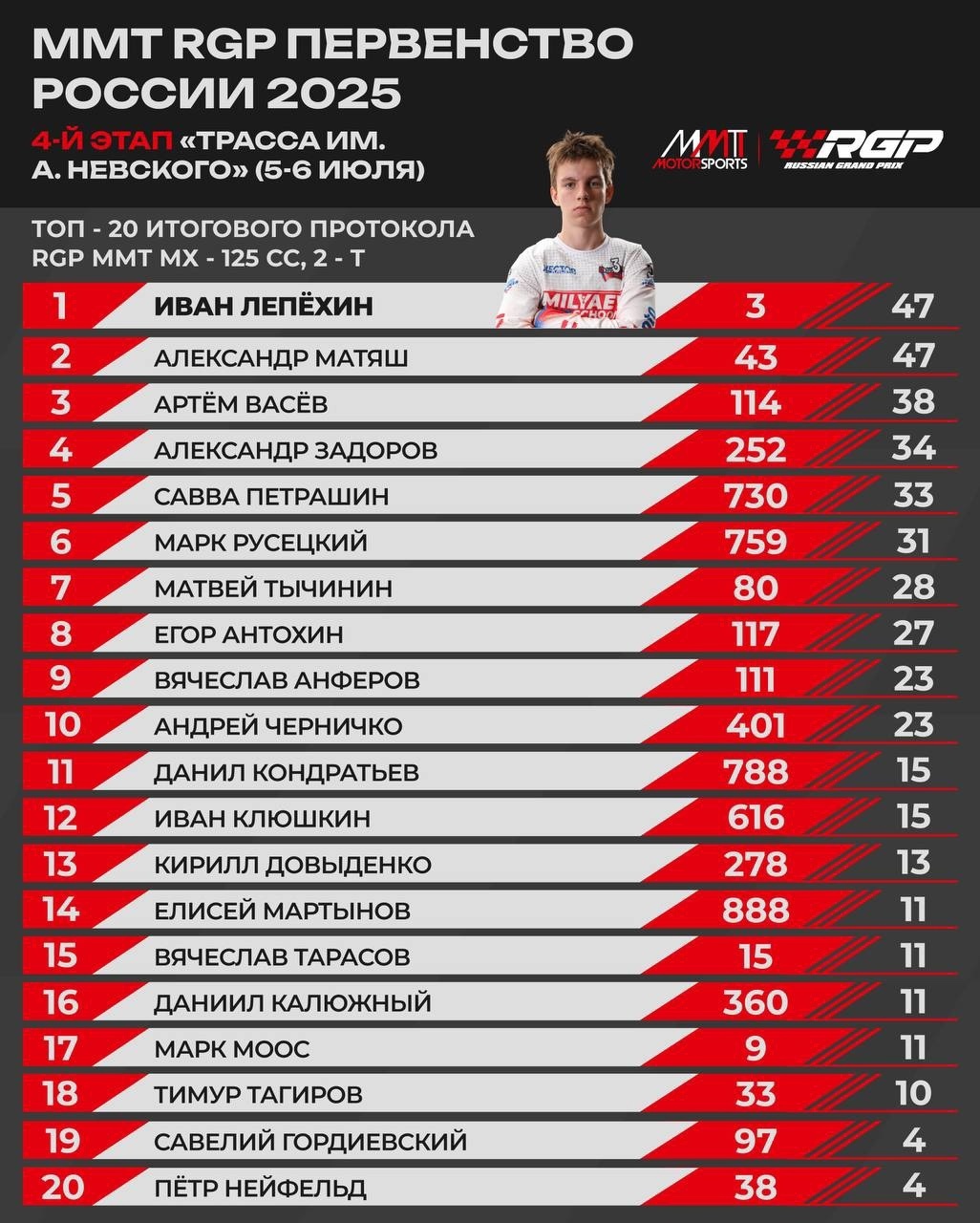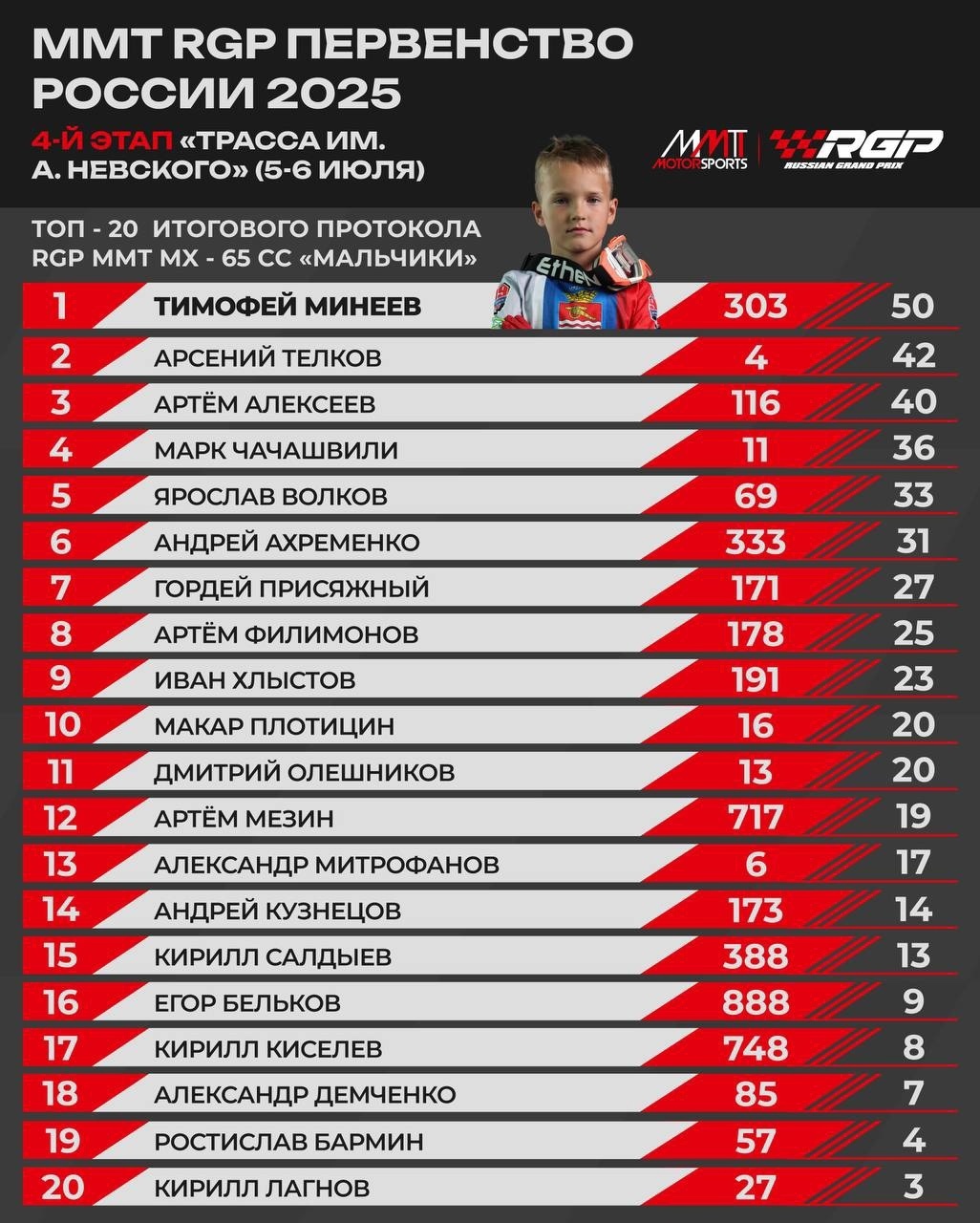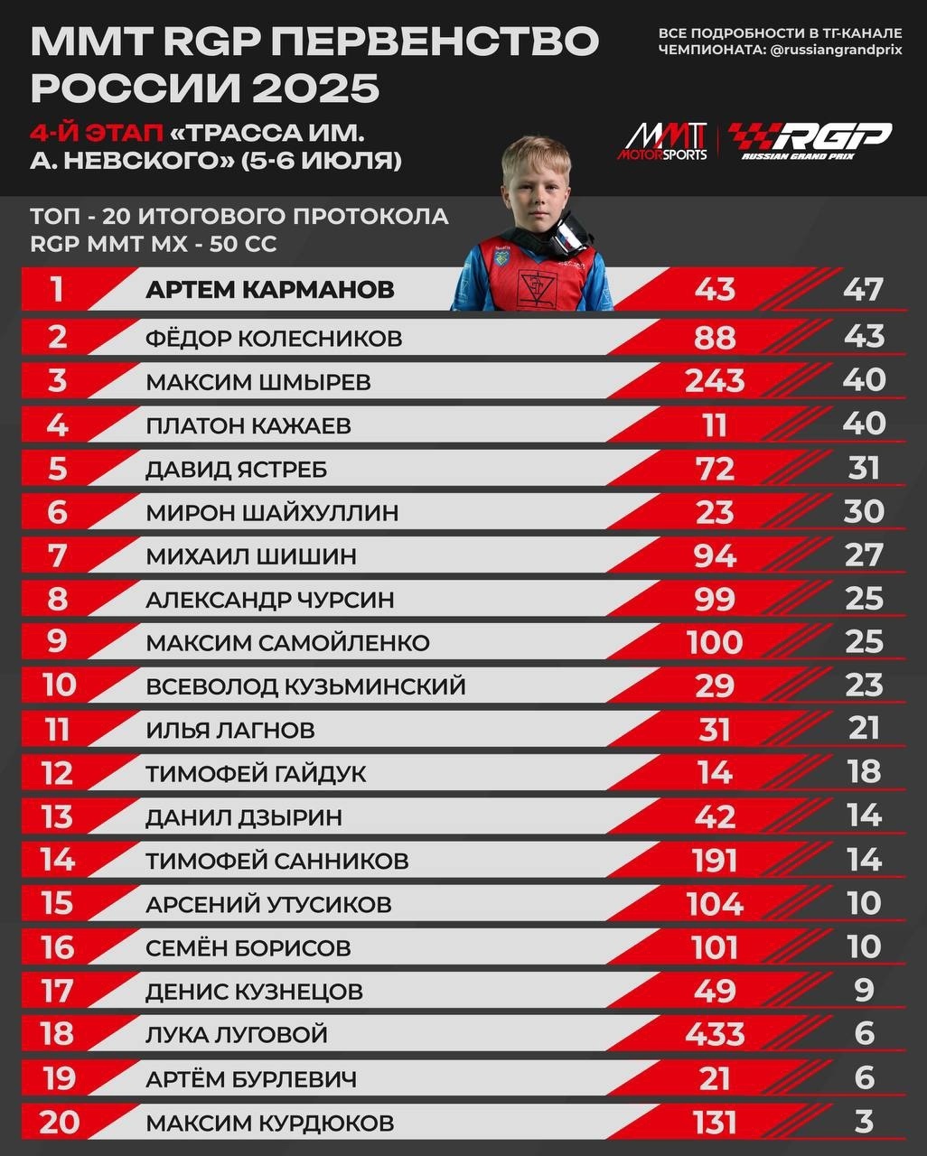 В классе 50сс (Первенство МФР) победителем стал Артем Карманов. После 4-х этапов он уверенно возглавляет общий зачет.