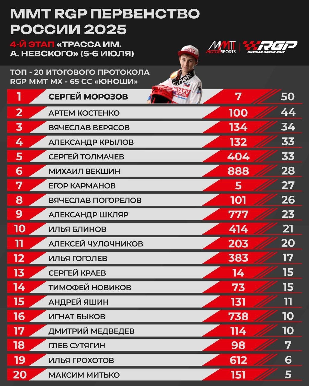 В классе 65сс «юноши» Артем Костенко стал вторым призером и также возглавляет общий зачет. Михаил Векшин по итогам заездов шестой, а Егор Карманов – седьмой. У Кирилла Люлькова 25-й результат.