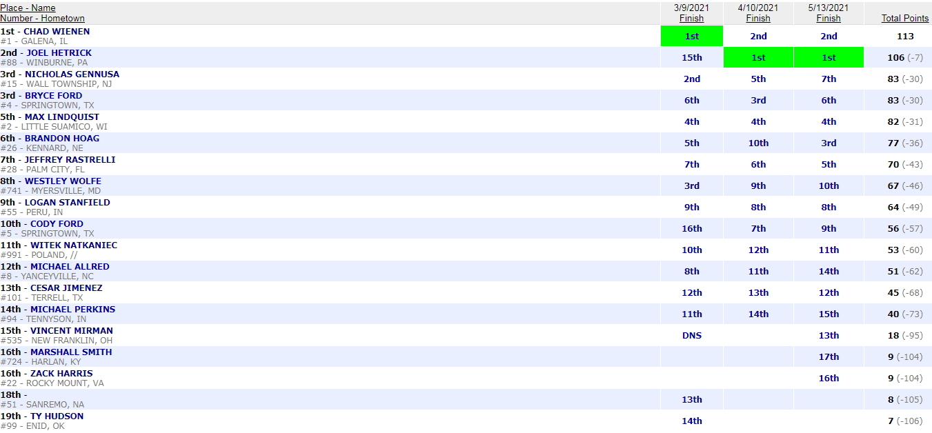Действующий чемпион серии и лидер общего зачета Чад Винен выступающий за собственную команду Wienen Motorsport/Maxxis/SSi Decals/Fly Racing/Yamaha занял второе место. Третьим стал Хог Брендон выступающий за Honda.