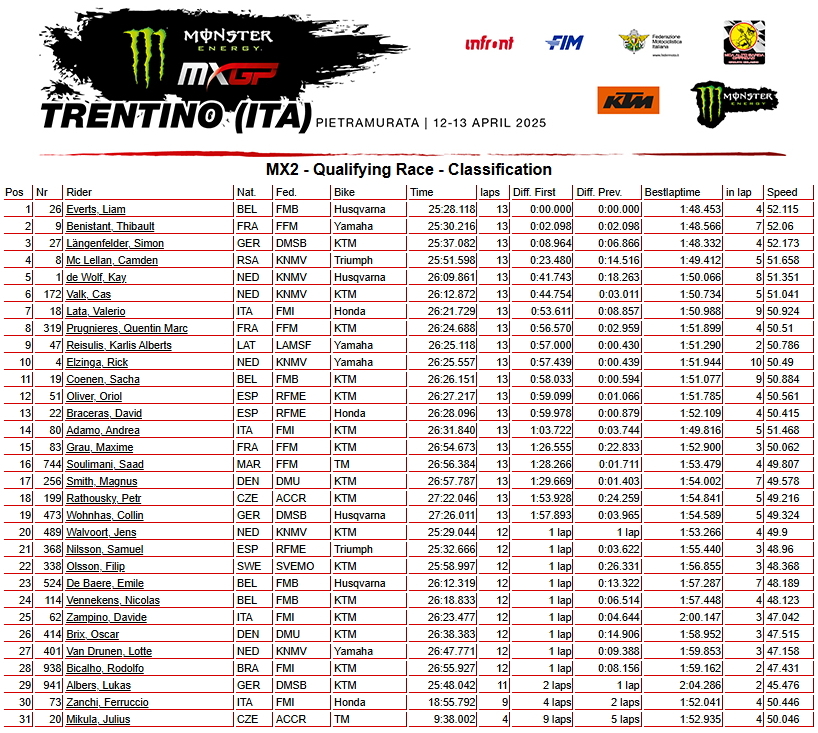 Победителем в классе МХ2 стал бельгиец Лиам Эвертс. голландская гонщица Лотте Ван Друнен показала 27–й результат.