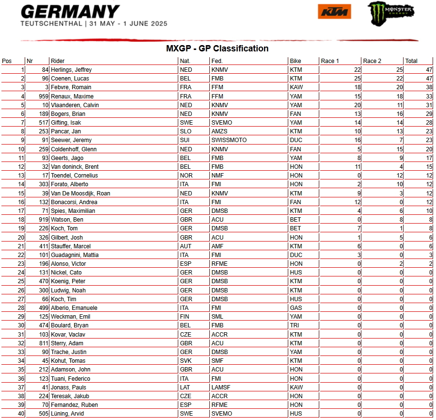 Сегодня, 1 июня на трассе в Тойчентале прошли основные заезды 10-го этапа Чемпионата мира по мотокроссу 2025 года - Гран-при Германии.