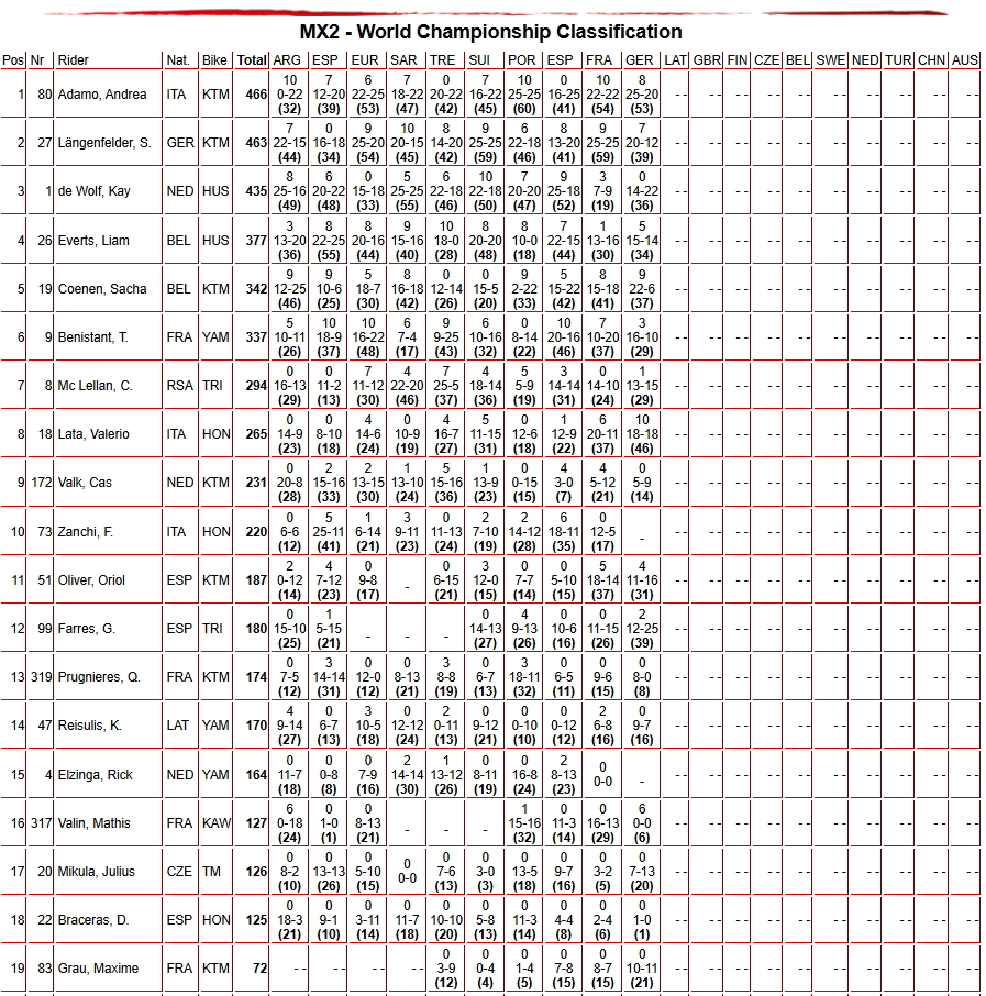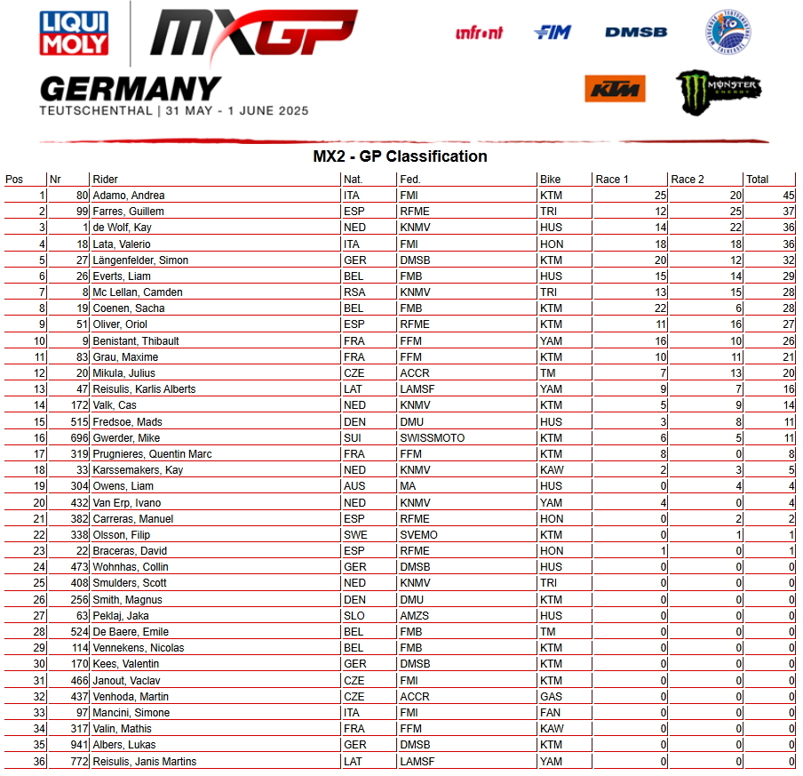 Победителем в классе МХ2 стал итальянец Андреа Адамо, став новым лидером общего зачета. Второе место у испанца Гиллема Фарреса, третье место у голландца Кея Де Вольфа.