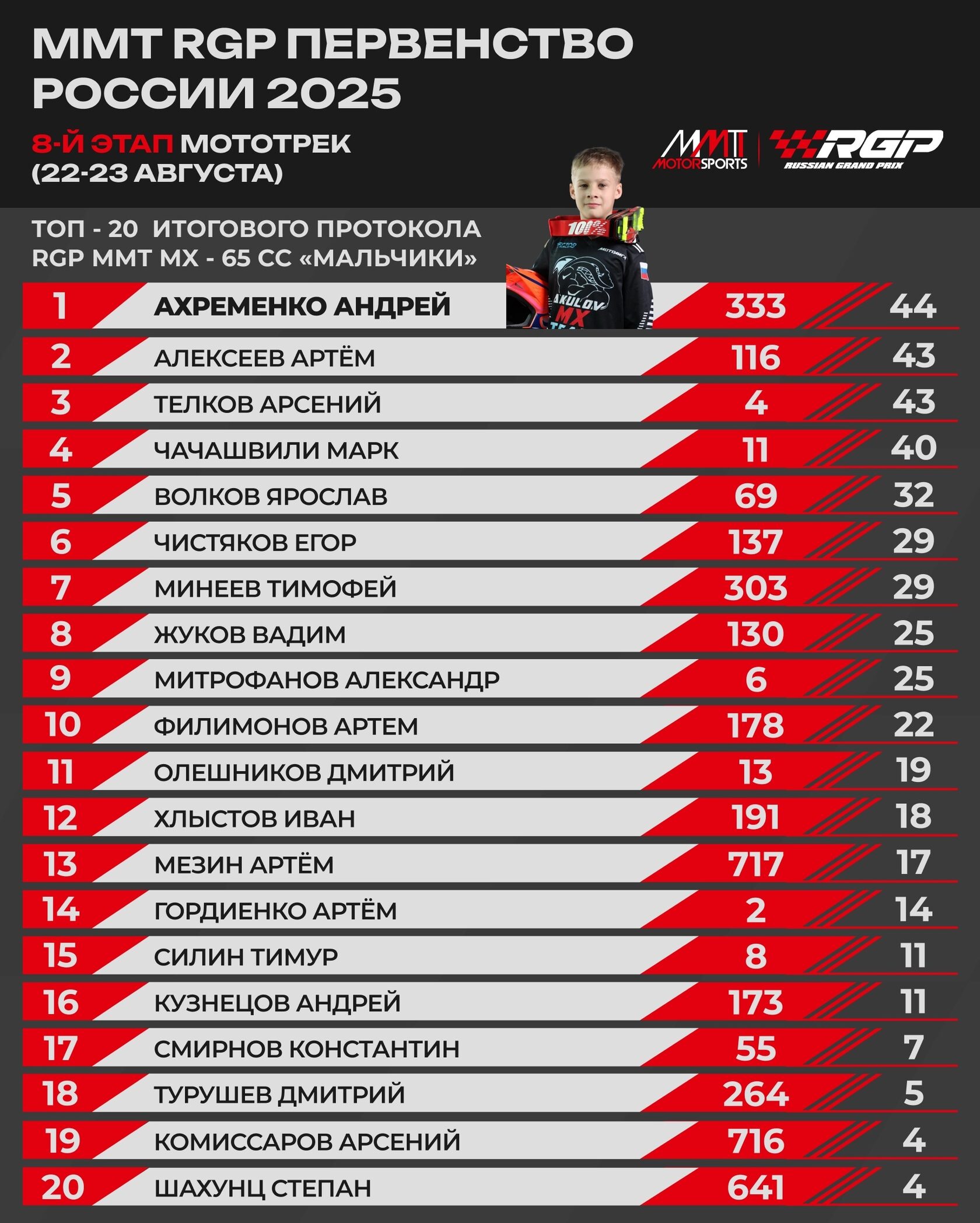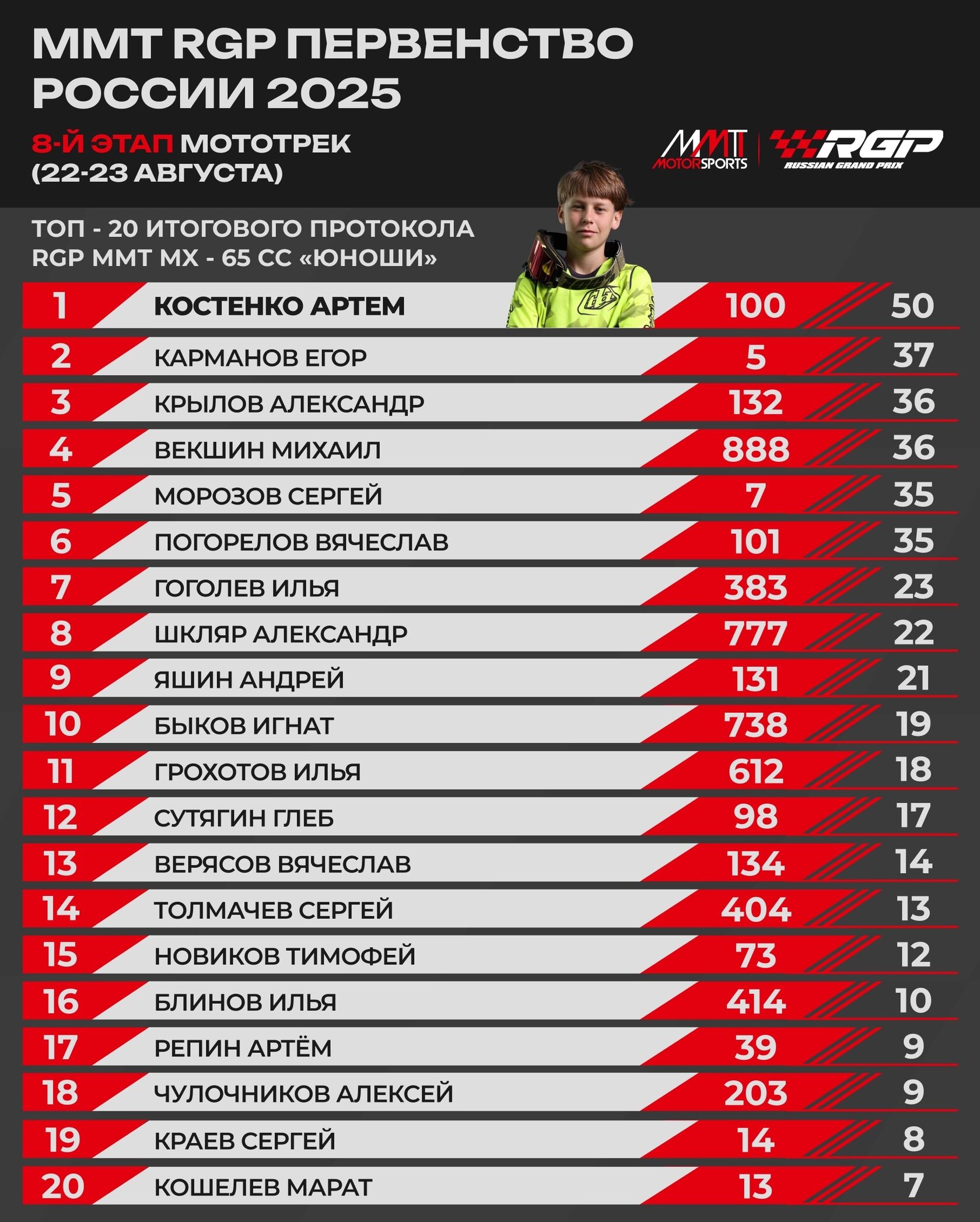 В классе 65сс «юноши» гонщики команды показали высокие результаты: Артем Костенко завоевал очередную победу и стал победителем Первенства России 2025 года.