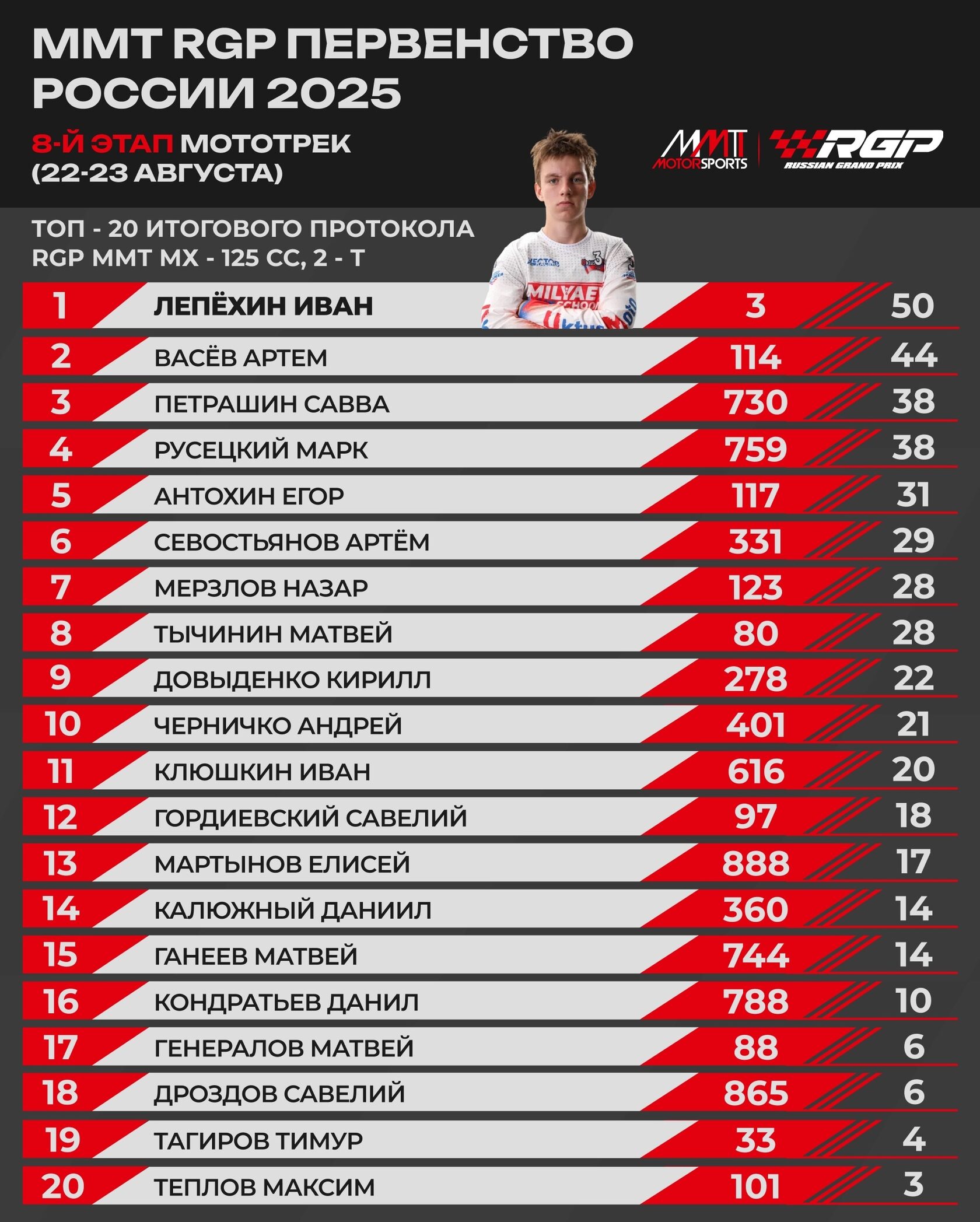 Егор Карманов на финальном этапе стал вторым и у него четвертое место по итогам чемпионата. Кирилл Люльков на этапе участия не принимал и по итогам сезона стал 10-м. Макар Золотов – 32-й.