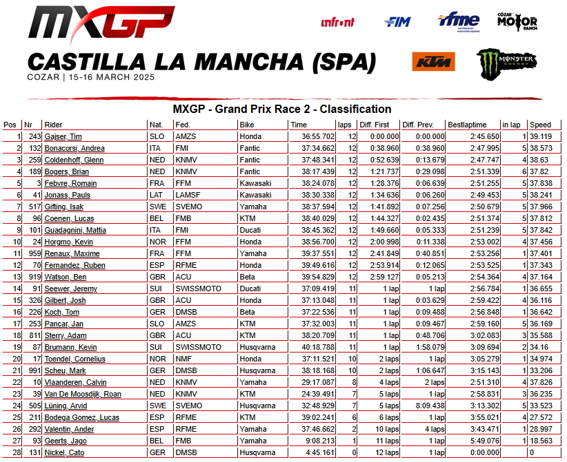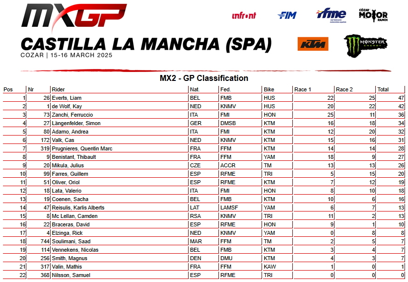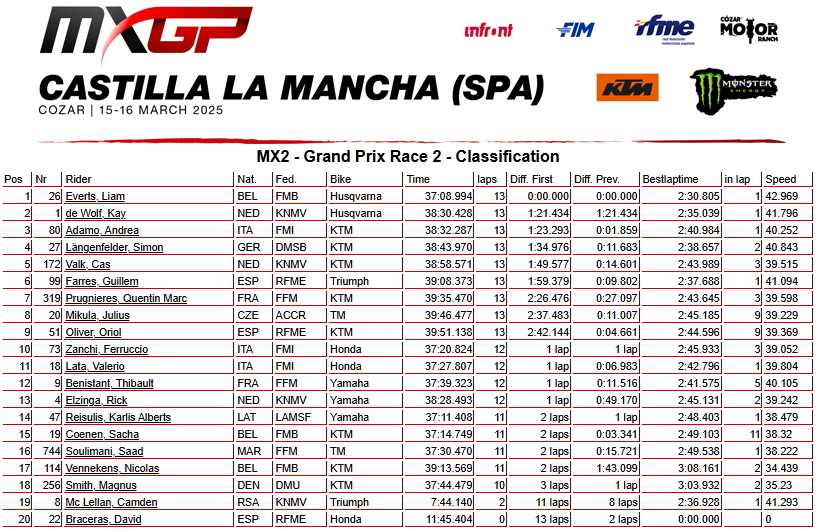 Победителем в классе МХ2 стал бельгиец Лиам Эвертс, чем удивил всех. Учитывая малое время на подготовку в межсезонье из-за травмы, он занял четвертое место в Аргентине и вот, наконец долгожданная победа. Второе место у действующего чемпиона - голландца Кея де Вольфа, третье у итальянца Ферручо Занчи.