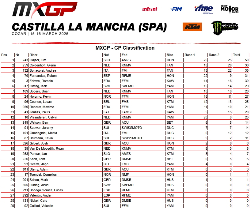 В классе MXGP выиграв оба заезда, абсолютным победителем стал словенец Тим Гайсер. Второе и третье места у голландца Гленна Колденхоффа и итальянца Андреа Бонакорси соответственно.
