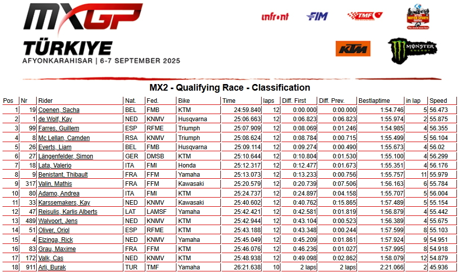 Бельгиец Саша Кунен одержал свою первую в карьере победу в квалификации в классе МХ2. В MXGP – сильнейшим оказался его брат Лукас Кунен.