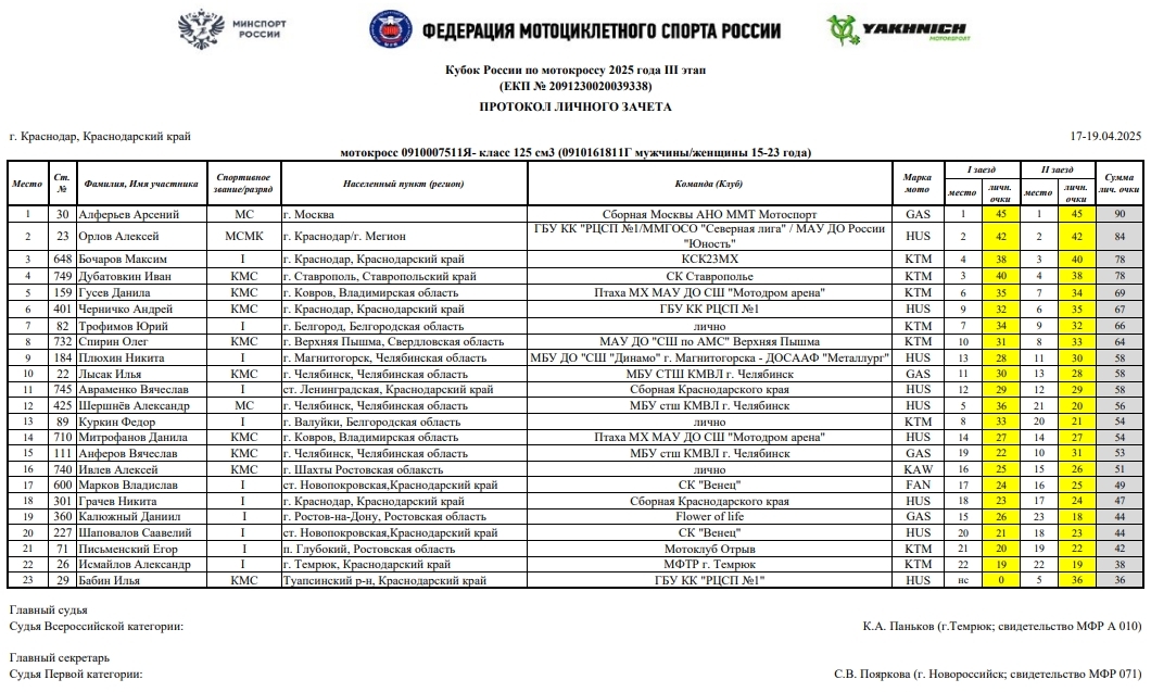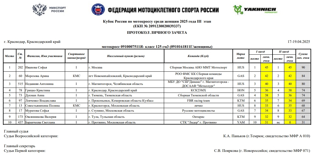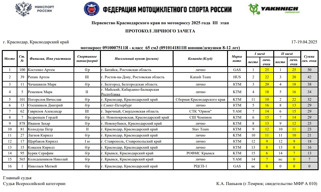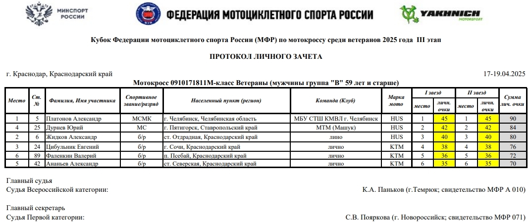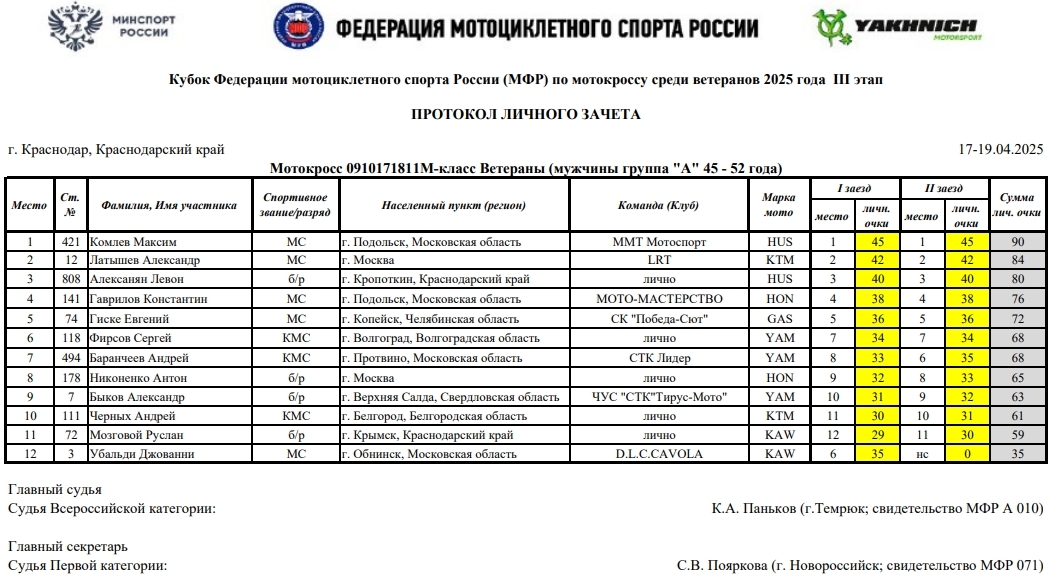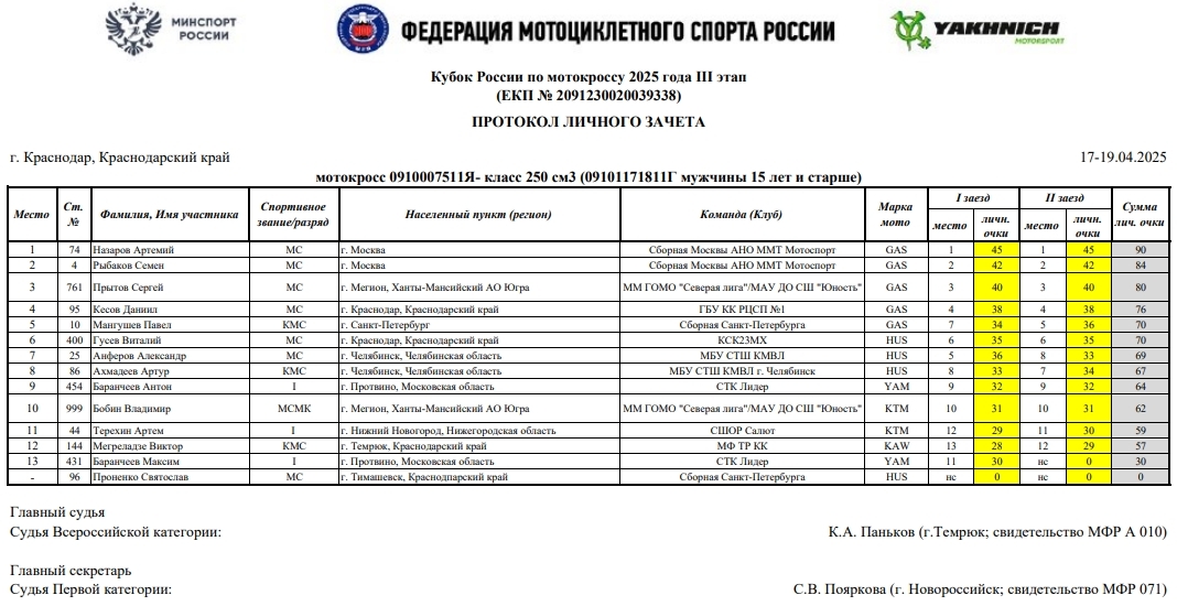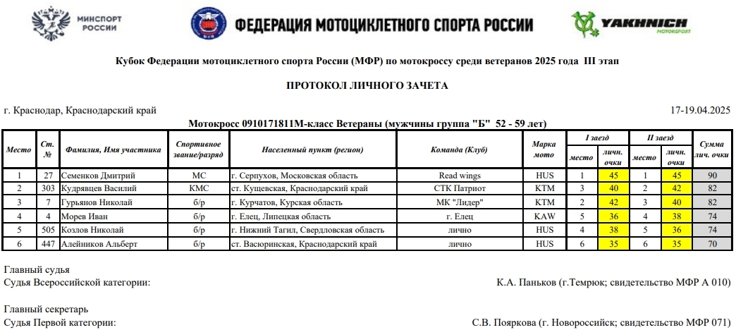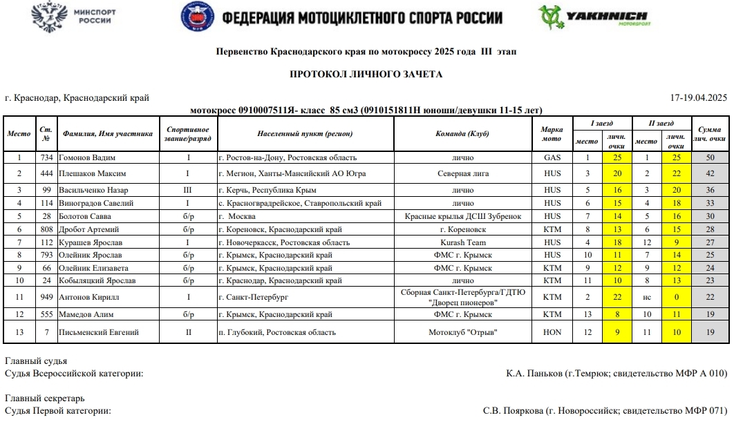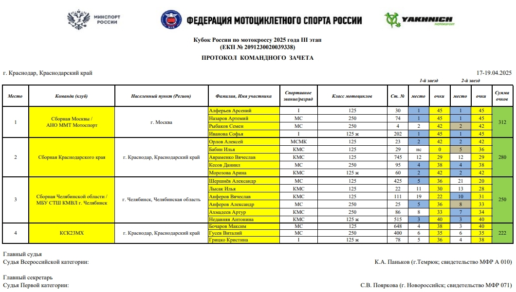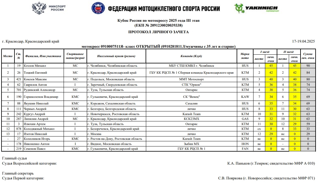 В минувшие выходные 19 и 13 апреля в г.Краснодаре прошел третий этап Кубка России по мотокроссу 2025 года (мужчины и женщины), Кубка МФР среди ветеранов, а также Первенства Краснодарского края.