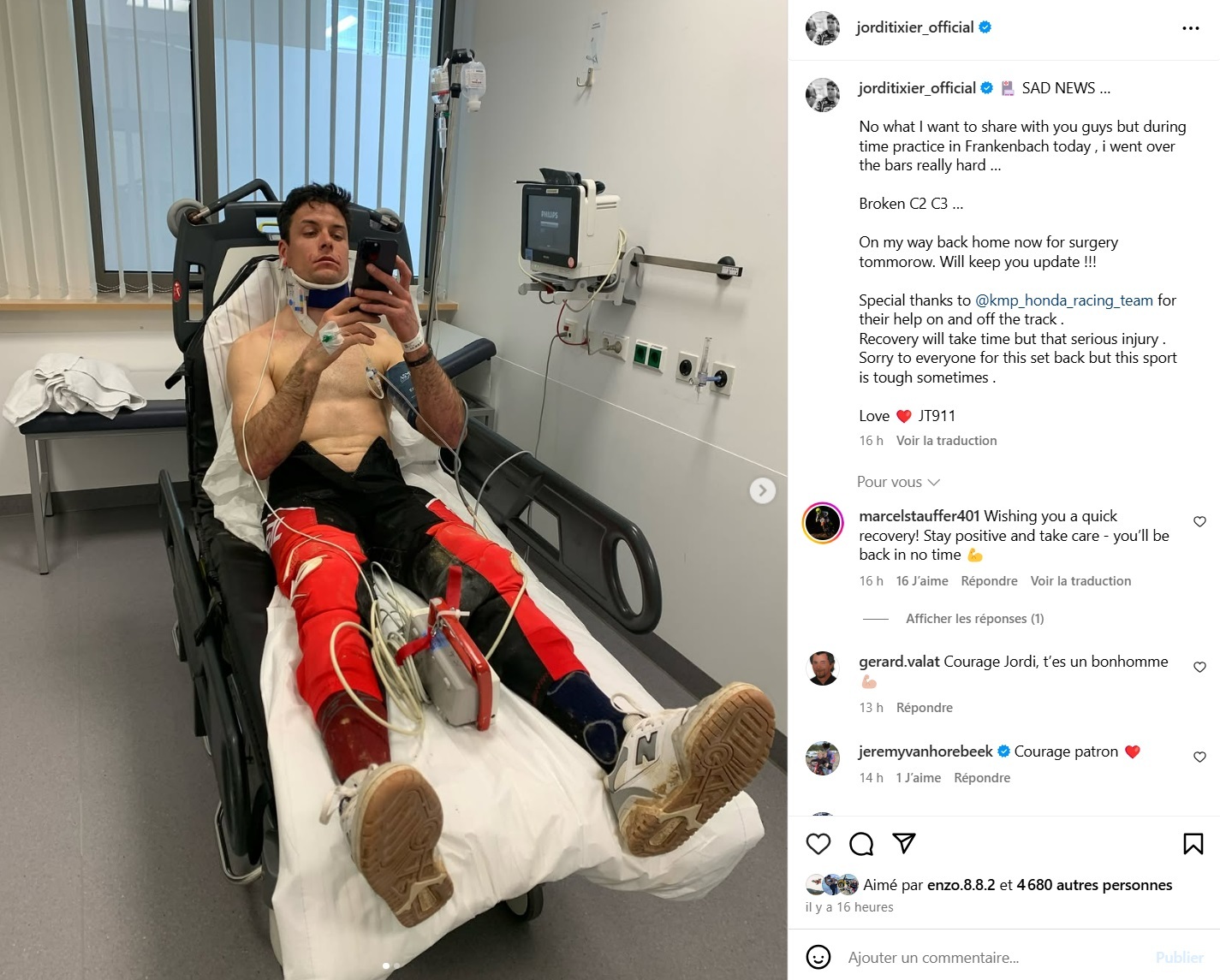 Хорди Тиксье: «Это не та новость, которой я хотел поделиться, но в воскресенье, во время хронометрированной тренировки во Франкенбахе я перелетел через руль. У меня сломаны позвонки C2 и C3. В понедельник я ложусь на операцию. Буду держать вас в курсе хода операции. Благодарим команду KMP Honda за помощь на трассе и за ее пределами. Восстановление будет долгим, так как травма серьезная. Приношу всем извинения за причиненные неудобства, но этот вид спорта порой может быть очень жестоким».