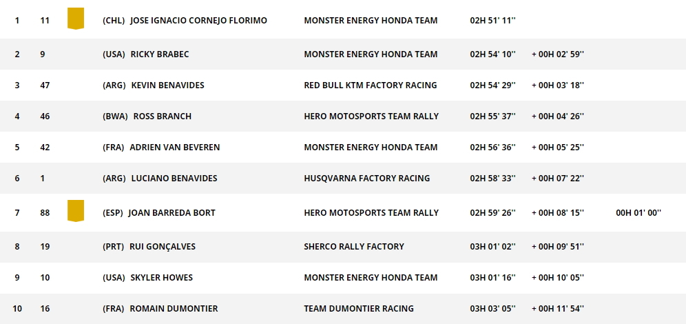 В зачёте мотоциклов лучший результат показал гонщик заводской Honda чилиец Хосе Игнасио Корнехо Флоримо и стал лидером общего зачёта. Вторым был его его товарищ по команде - американец Рики Брабек. Третье время у представителя Аргентины Кевина Бенавидеса (КТМ).