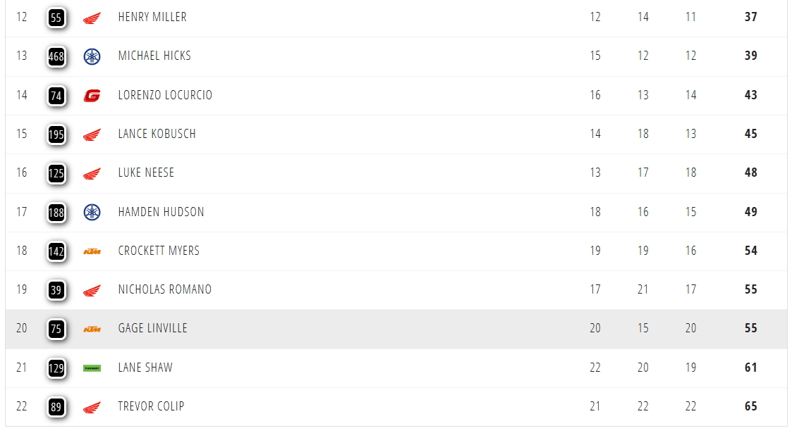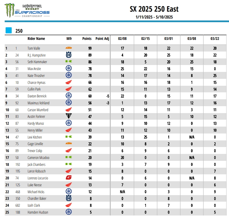 Победу в классе 250SX Восточного побережья одержал Нейт Трэшер, второе место занял Р.Дж.Хэмпшир, третье место у Тома Виалла.