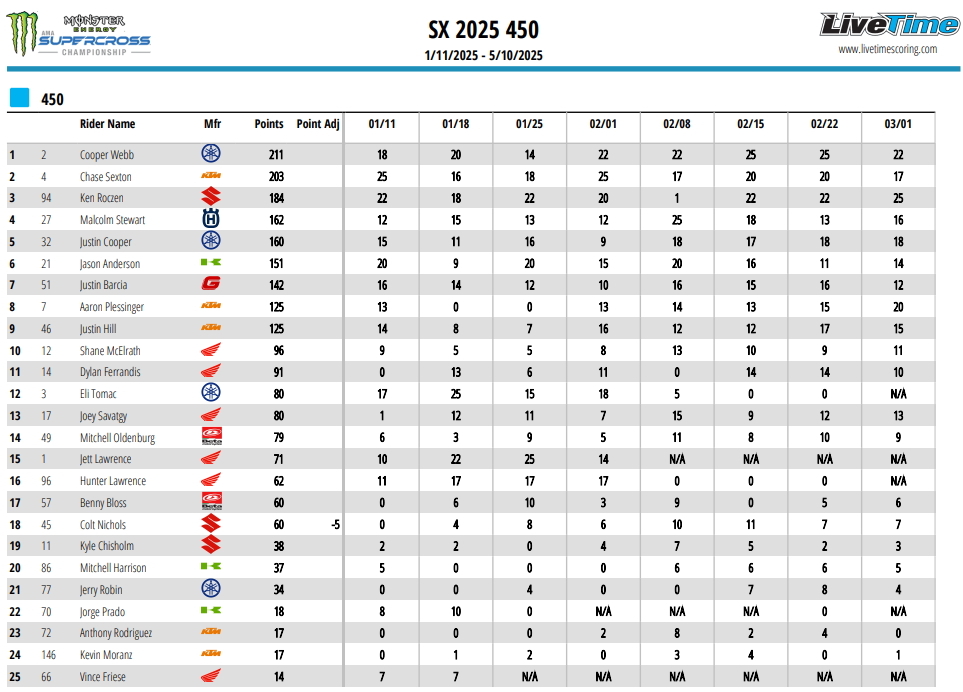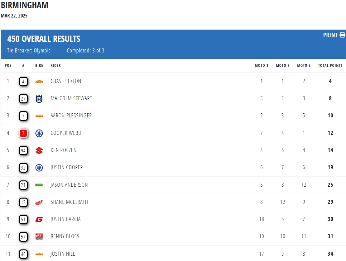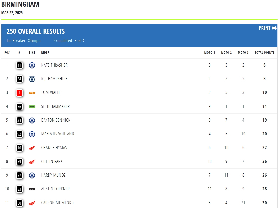 В минувшую субботу, 22 марта в Бирмингеме в формате трех финалов «Triple Crown» прошел 10-й этап серии АМА Суперкросс 2025 года в классе 450SX, а также 5-й этап 250SX Восточного побережья.