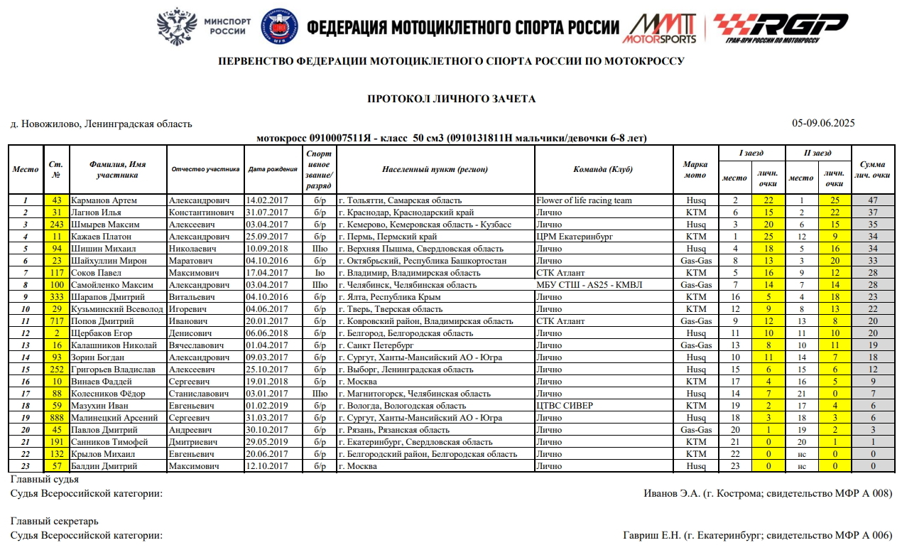 В классе 50сс (Первенство МФР) по итогам двух заездов победителем и обладателем «холшот» стал Артем Карманов (стартовый номер 43).