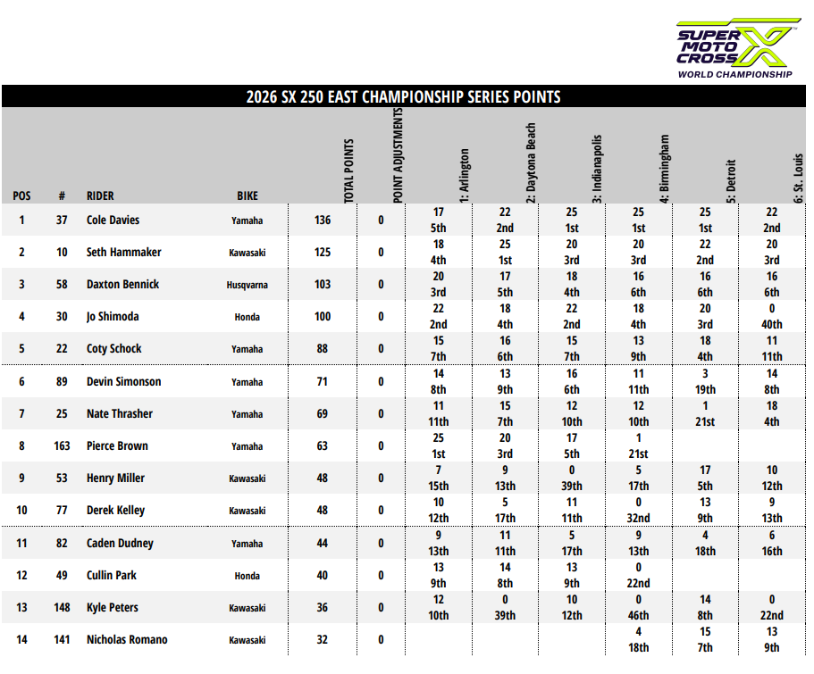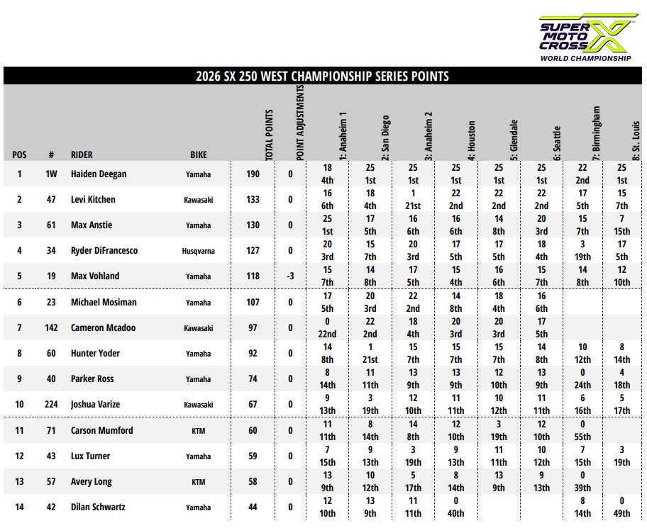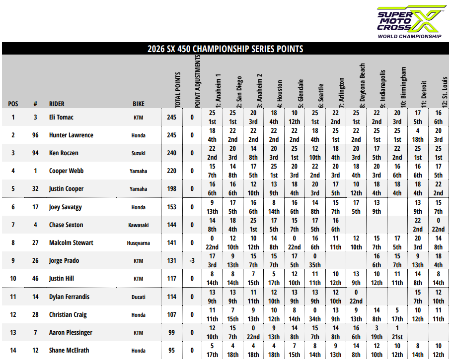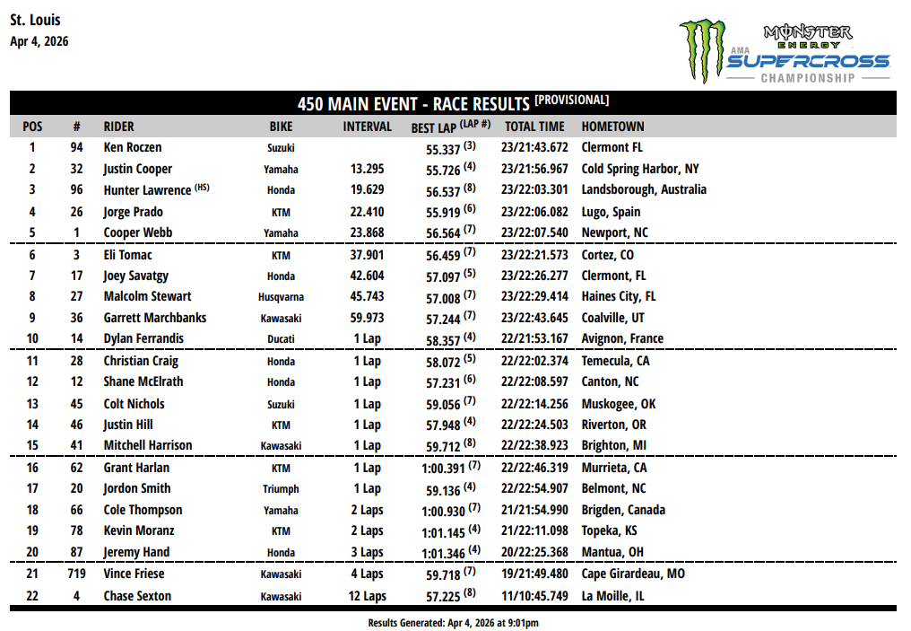 В минувшую субботу, 4 апреля на стадионе на стадионе The Dome at America's Center в Сент Луисе (штат Миссури) прошел 12-й этап серии АМА Суперкросс 2026 года в классе 450SX, а также 6-й этап в классе 250SX Восточного побережья и 8-й этап в классе 250SX Западного побережья.