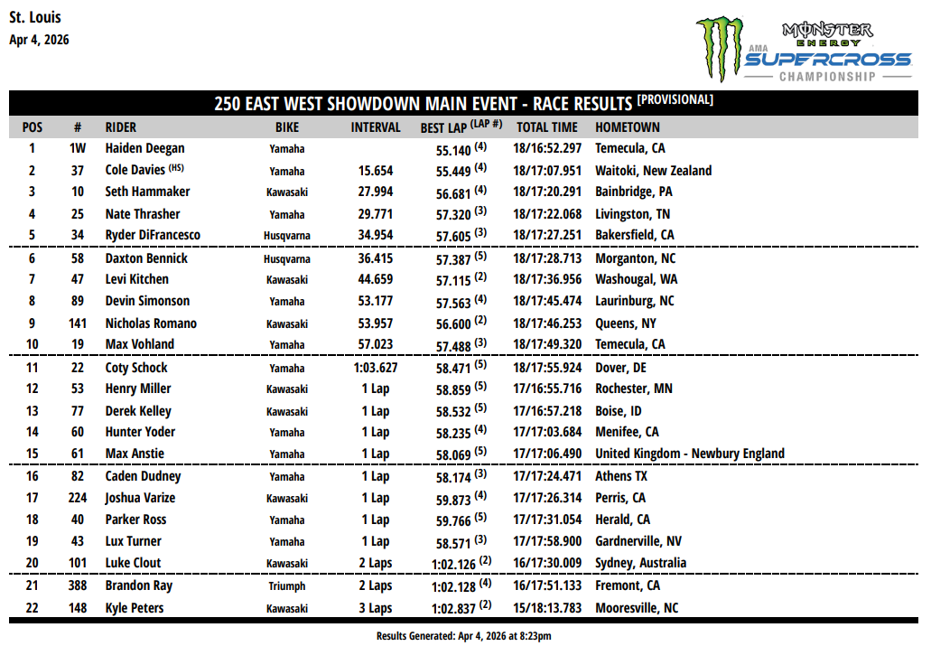 Победу на втором совместном этапе в классе 250SX Восток/Запад одержал Хайден Диган и досрочно завоевал титул за два этапа до конца серии. Второе и третье места у Коула Дэвиса и Сэта Хэммейкера соответственно.