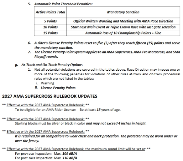 Наряду с новой системой начисления баллов, AMA также ужесточает правила в отношении нарушений, связанных с агрессивной или безрассудной ездой. До сих пор за первое нарушение такого рода полагалось простое предупреждение. Начиная с сезона 2026 года, гонщик, оштрафованный по этой причине на протяжении всего чемпионата SMX, получит дополнительно минус 5 очков в турнирной таблице чемпионата плюс штраф.