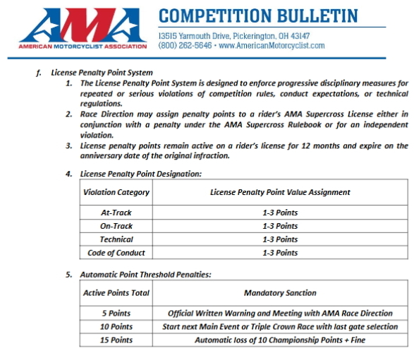 Эти санкции применяются на протяжении всего сезона в США и распространяются на чемпионаты по суперкроссу, мотокроссу и SMX, при этом пересмотр санкций между чемпионатами не производится.