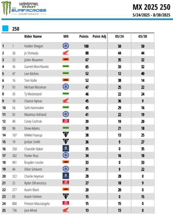 Абсолютным победителем в классе 250МХ стал Хайден Диган. Второе и третье места заняли Джо Шимода и Леви Китчен.