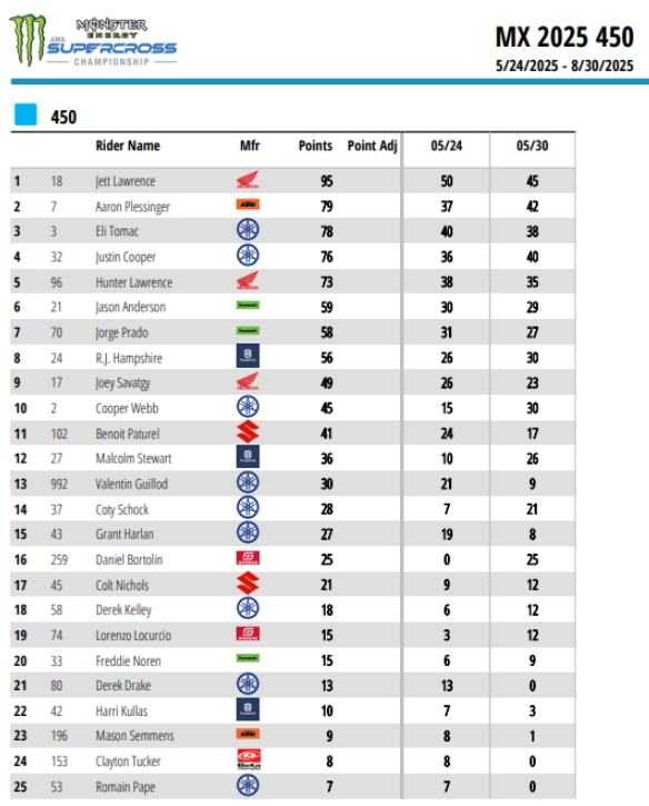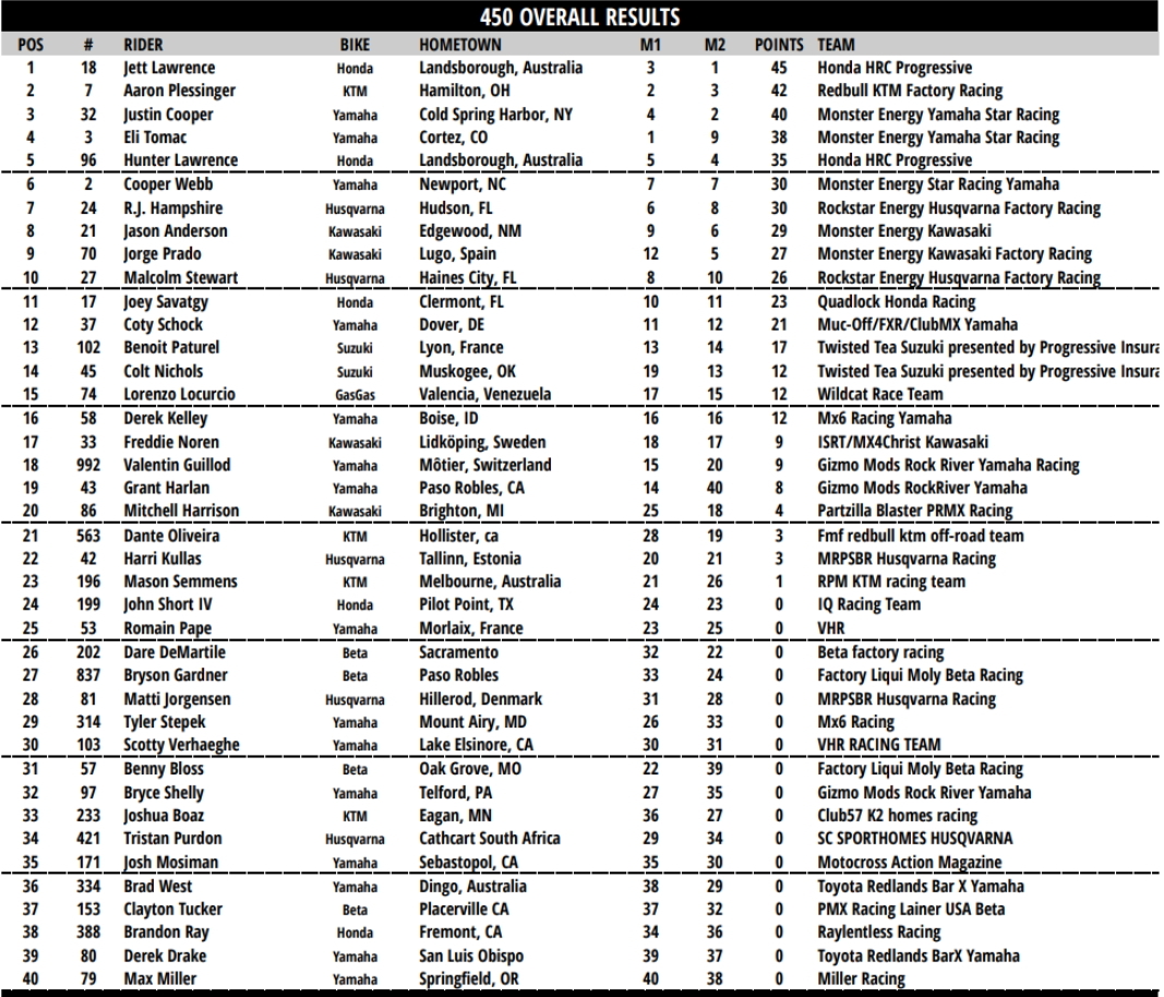 В классе 450МХ победу одержал Джетт Лоуренс. Второе место у Аарона Плессинджера, третьим стал Джастин Купер. Испанец Хорхе Прадо по итогам заездов занял 9-е место.