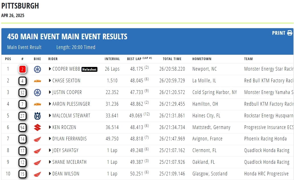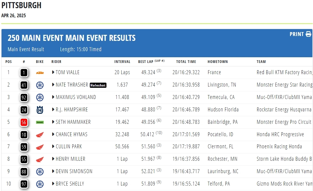 В минувшую субботу, 26 апреля в Питтсбурге прошел 15-й этап серии АМА Суперкросс 2025 года в классе 450SX и 9-й этап в классе 250SX Восточного побережья.