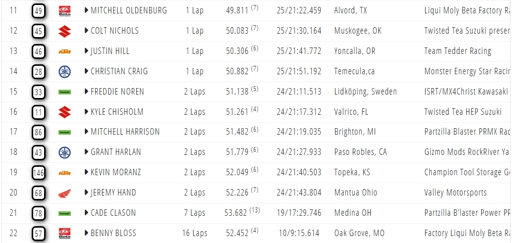 В классе 450SX победителем стал Купер Уэбб и увеличил отрыв в общем зачете на 12 очков от Чейза Секстона, который занял второе место. Третьим финишировал Джастин Купер.