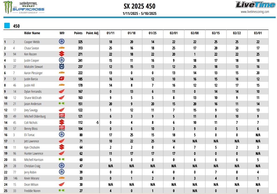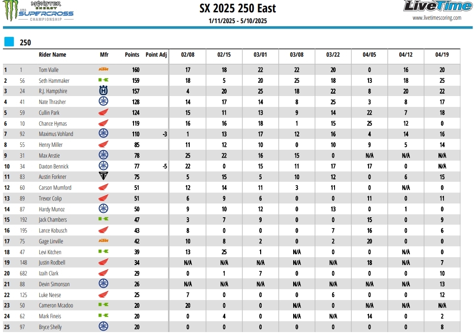 Следующий, 16-й этап (предпоследний) серии АМА Суперкросс 2025 года в классе 450SX и 9-й этап в классе 250SX Западного побережья состоятся 3 мая в Денвере (Колорадо).