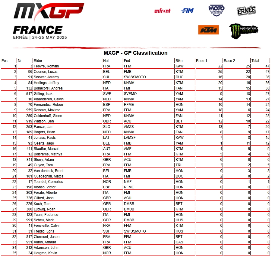 В классе MXGP сильнейшим оказался "хозяин трассы" и лидер общего зачета француз Ромен Февр, который набрал одинаковое количество очков со вторым призером - бельгийцем Лукасом Коэненом..Третьим стал швейцарец Джереми Сивер и завоевал второй подиум для команды Ducati в премьер-классе.