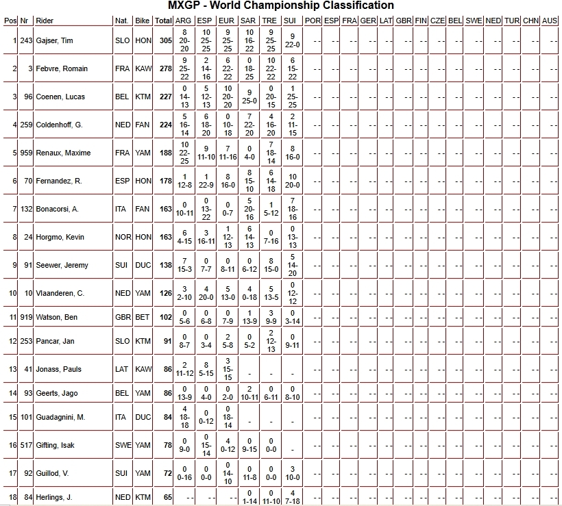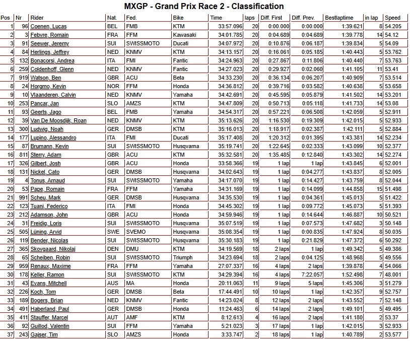 В классе MXGP сильнейшим оказался бельгиец Лукас Коэнен. Он одержал победу в обоих заездах и завоевал свою первую победу в премьер-классе. Второе место у француза Ромена Февра (6-3), третьим стал швейцарец Джереми Сивер (7-3), чем сильно порадовал своих болельщиков.