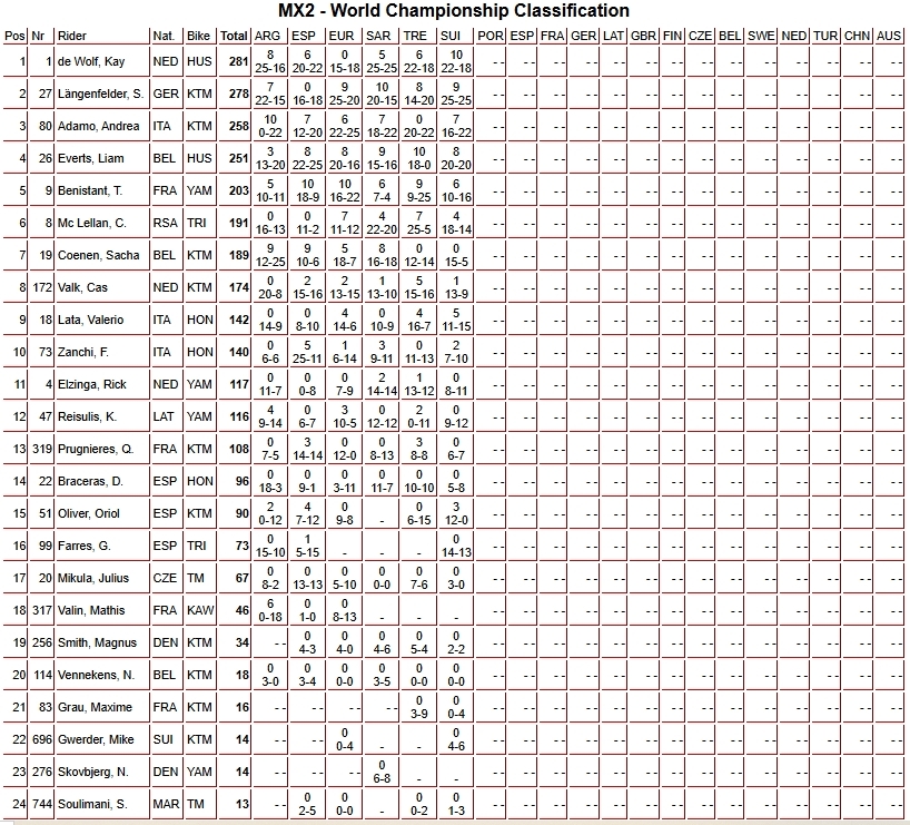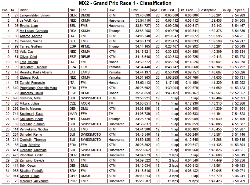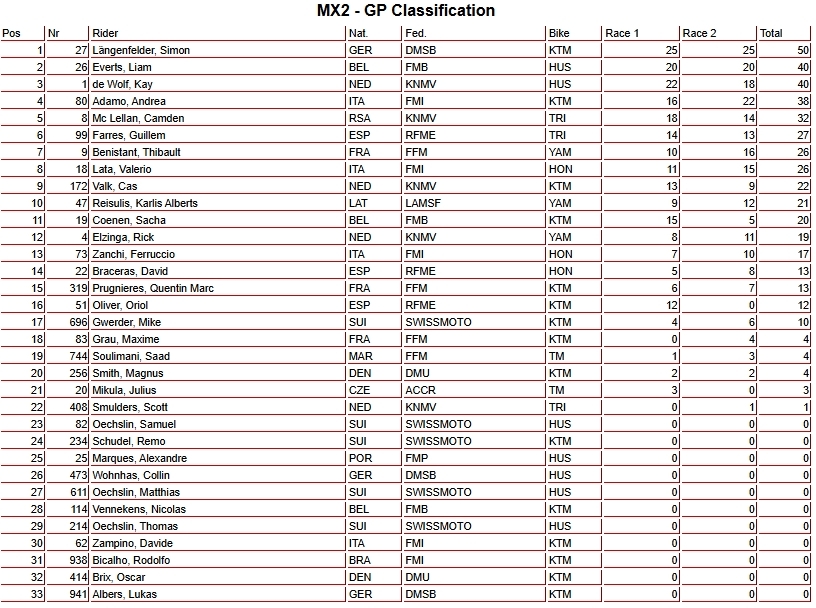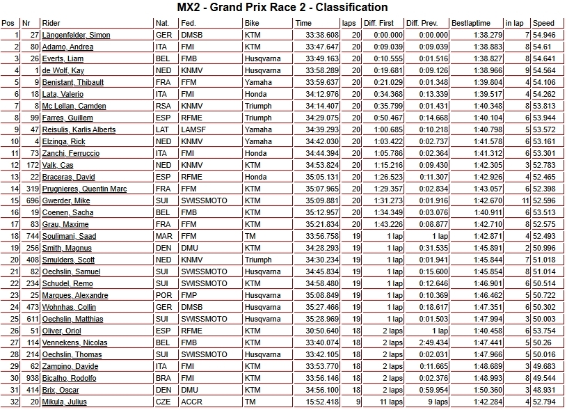 Абсолютным победителем в классе МХ2 стал Симон Лангенфельдер. Немецкий гонщик завоевал четвертую победу в карьере, 20 месяцев спустя после своей третьей победы на Гран-при Швеции в Уддевалла. Второе и третье места заняли бельгиец Лиам Эвертс (3-3) и голландец Кай де Вольф (2-4).