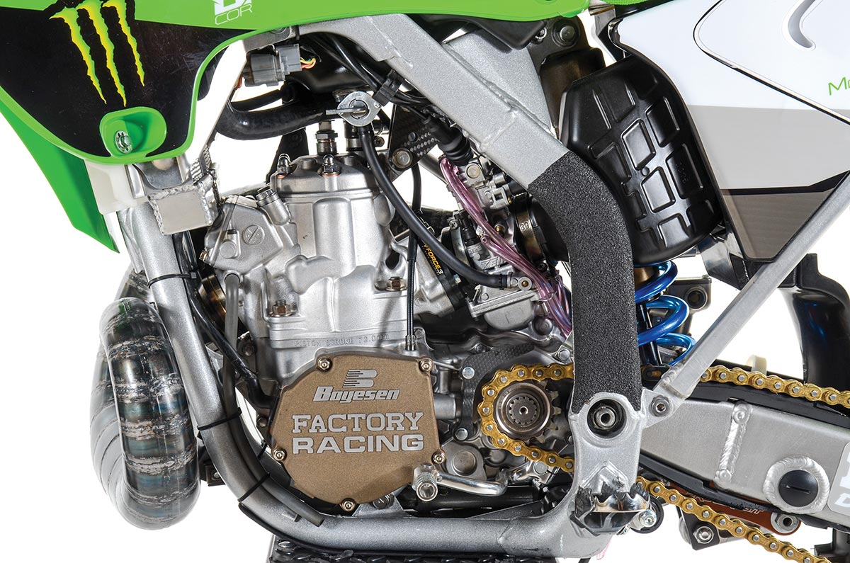 Одно серьезное улучшение в производительности в виде выхлопной системы ручной работы сделал один из давних спонсоров Джереми, Митч Пэйтон и команда Pro Circuit. В Pro Circuit сделали сверхсекретные характеристики конусного резонатора и поставили глушитель из титана и карбона, которому позавидовал бы любой любитель двухтактных мотоциклов. Они даже изменили логотип на резонаторе на «2022 MC».
